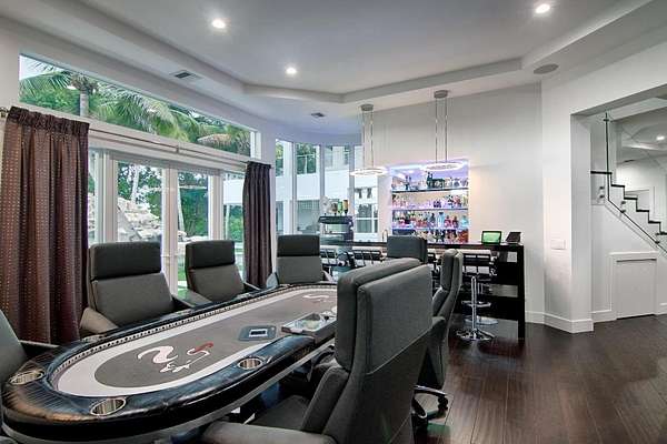 The large game room has a wet bar with glass illuminated shelves. Double doors lead out to the pool area. Naturally, the theatre portion has a starlight ceiling.
