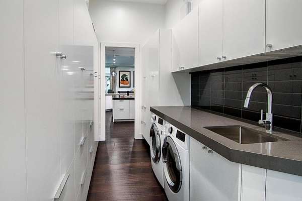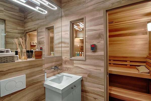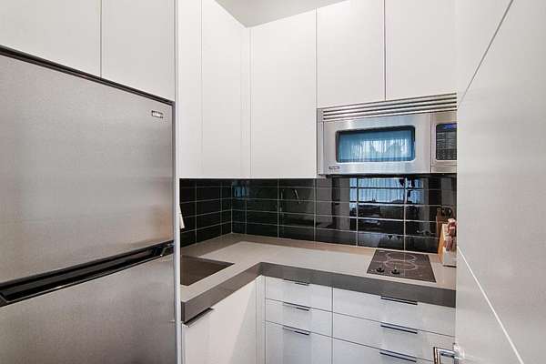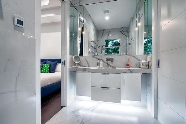 The master bedroom suite consists of an extremely large bedroom, an attached workout or massage room, a morning kitchen with two refrigerator drawers and a built in concealed microwave and sink, two walk in closets, and a glamorous large master bath with Jacuzzi tub, dual vanities, large frameless glass walk in shower, heated flooring, and an infrared sauna. The large private outdoor balcony, wrapped in a stainless steel railing, is partially covered and partially open with an outdoor shower.