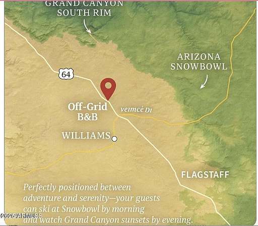 Investor's Dream: Dual Parcels Zoned RM-10/A - Williams, AZ (Highways 64 & 180) 2 Parcels | 2.5 Total Acres | Up to 25 Cabins Permitted. Positioned just minutes from Valle Airport and along the bustling tourism corridor leading to the Grand Canyon South Rim, these two RM-10/A-zoned parcels open the door to serious income potential. This zoning allows up to 25 cabins, tiny homes, or vacation suites - making this one of the most flexible and profitable small-scale hospitality investments in the region. Surrounded by proven lodging success stories like Clear Sky Resorts, Under Canvas Grand Canyon, The Dumplin Patch B&B, and Grand Canyon Inn, this location already draws consistent traveler demand. Investors can tap directly into the Grand Canyon tourism stream 6+ million visitors a year while operating off-grid in a sustainable, low-overhead format. With highway visibility, nearby resort anchors, and just a short drive to Flagstaff Snowbowl Ski Resort, this is where nature, adventure, and profitability meet. Imagine: Your boutique eco-resort, glamping village, or cabin community offering guests starlit skies, national-park access, and high nightly rates. Addition MLS 199979 Shows with Cabins and includes the Off Grid B and B business package,.
