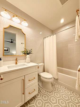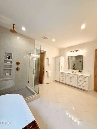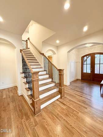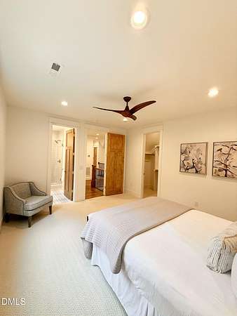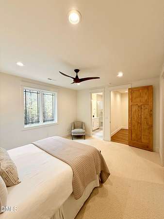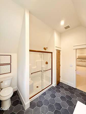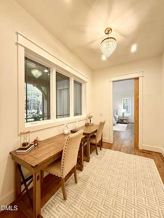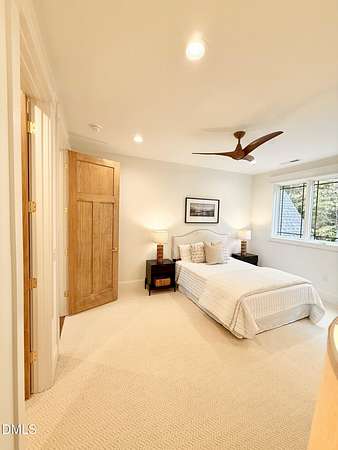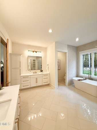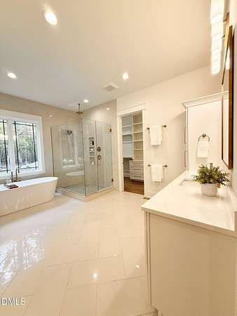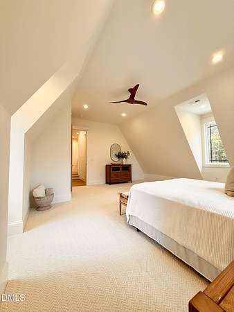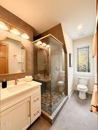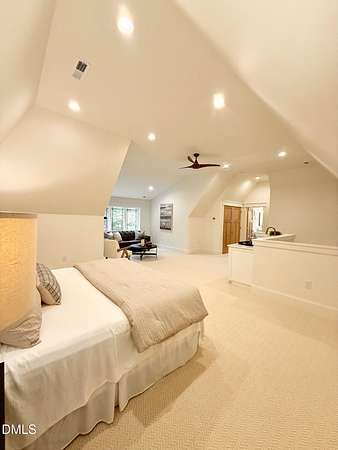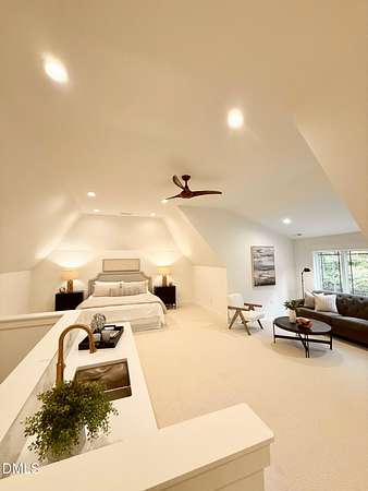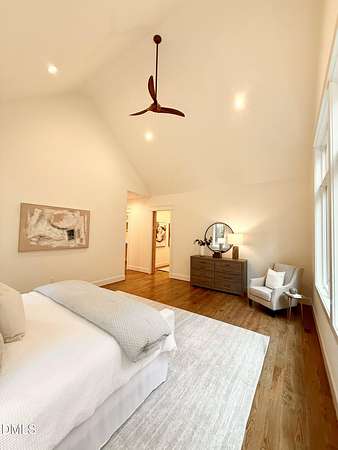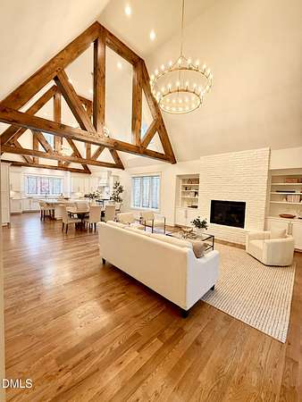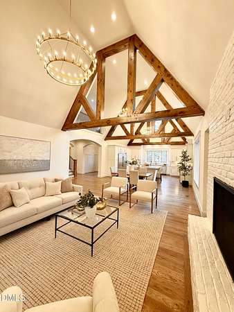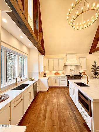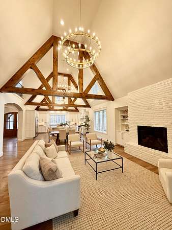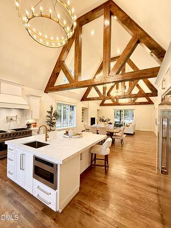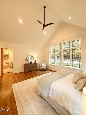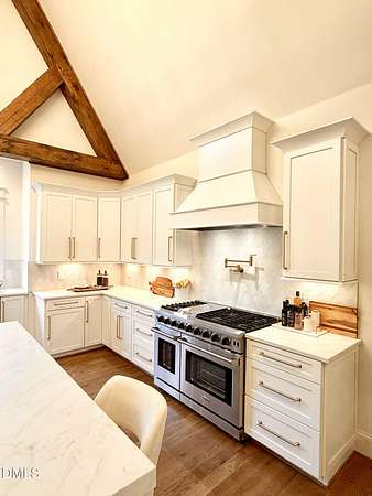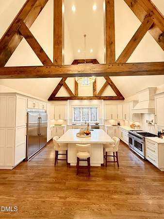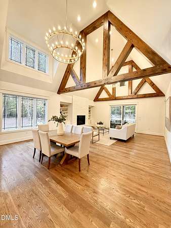 Absolutely gorgeous brand new Tudor in a brand new development in the Chapel Hill City Schools with Orange County Taxes on two acres of beautiful high elevation land with rock outcroppings, green grass and mature hardwood trees. Limestone detail, brick foundation, slate covered porch floors, copper accent roofing and a side load garage with an elevated home site create a striking presence. The complete package. The home is perfectly situated on the private two acre lot. Huge Pella Windows and Doors throughout with an open floor plan and a fabulous porch design that allows absolute indoor-outdoor integration. Vaulted ceilings in the open floor plan feature white oak hardwood floors and brand new everything from the ground up. The traditional timber frame trusses employ old-world mortise and tenon joinery secured with oak pegs. The 10'' white pine timbers give a rustic detail to an otherwise modern home giving the feel of a Mountain Modern Design. The Great Room brick fireplace with built-in cabinetry on each side will create ambiance and warmth on winter nights and provide an excellent backdrop to all the holidays to be spent in the home with family and friends. Interior doors are stained solid wood at 8 foot tall to provide a lofty feel. Arched openings in the foyer area are a design detail that adds to the airy and open floor plan. The painted trim throughout the house gives a refined detail with brushed gold fixtures, ivory wool carpet in all the right spaces for a cozy feel and wood tones throughout to create the ultimate in updated design. The third floor is designated as a bedroom with large windows, TV sitting area and a large full bathroom, but can be used as a theater room with kitchenette and lounge space or office. What a space for a home office....that view. The kitchen is the heart of the home with plenty of cabinet storage and spaces for multiple cooks and prep areas. The large quartz island has a prep sink and turned down granite countertop for all the conversations and meals to be had in the center of the home. The brand new appliances include Electrolux's five and half foot wide fridge-freezer with filtered water inside the fridge, 48'' gas range with griddle, quiet Bosch dishwasher and a drawer style microwave. The Superior Walls crawl space is heated and cooled with a concrete floor to provide plenty of storage space (over 2500 sqft at 48'' tall). The garage has an epoxy floor coating to give the feel of a finished room rather than just a garage. The new concrete driveway and parking area is ideal for a basketball hoop and provides an excellent recreation space. The primary suite on the main floor contains a vaulted bedroom, connected office between the bedroom and great room, absolutely huge bathroom with large separate vanities, double headed shower, free-standing bathtub and separate water closet. The primary suite also contains two closets with dressers built-in for ease of use. Also, every bedroom in the home has its own full bathroom. The arched double mahogany front door perfectly entails the fit and finish of such a wonderful home. Xfinity Spectrum internet is installed at 1 Gig standard. The home is wired for ethernet at every TV location, bedroom, office and loft areas. A smart ethernet panel rounds out the home providing connectivity in an otherwise private setting that feels more like a vacation home. The private road in the development is in the process of being paved with large shoulders and plenty of beautiful landscaping. Four homes out of 12 homes are in the process of being built and the neighborhood to the south, Oak Crest, is a wonderful collection of other fine custom homes. The property to the east consists of 90 Acres of UNC Chapel Hill land that is the start of University Lake. It is a beautiful parcel of land with walking trails and wild life throughout.