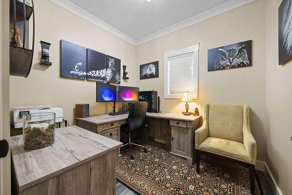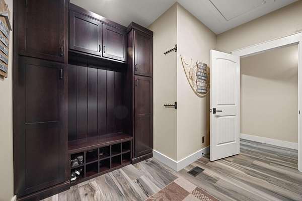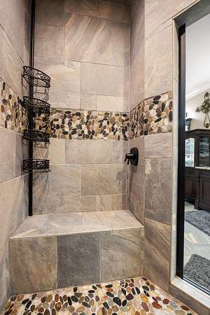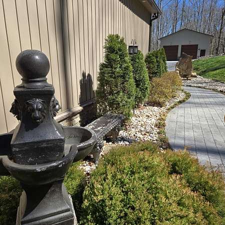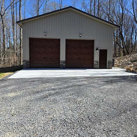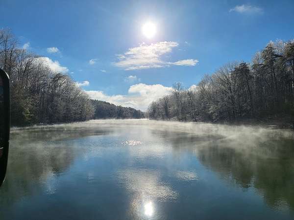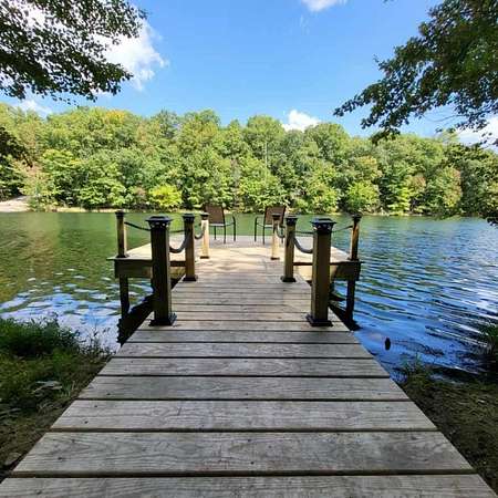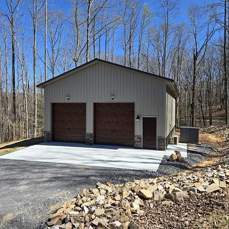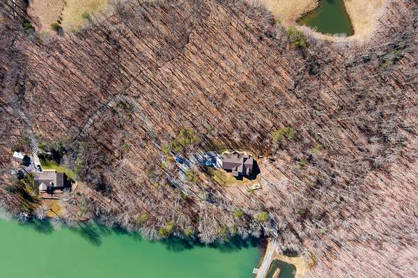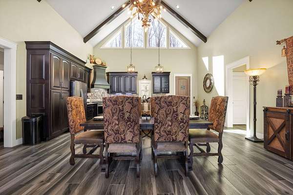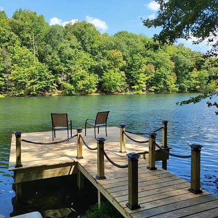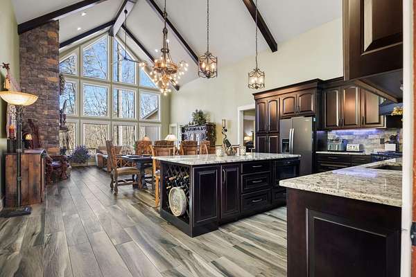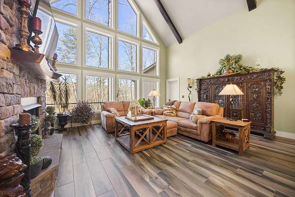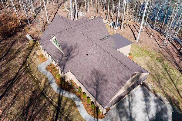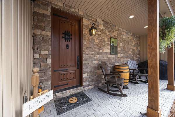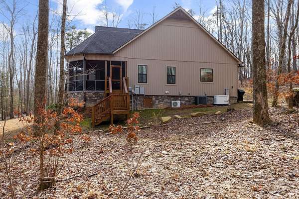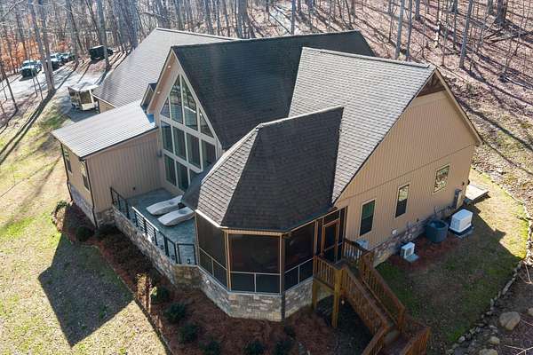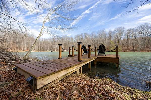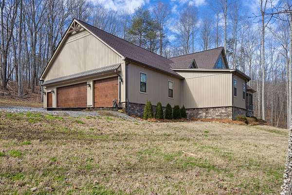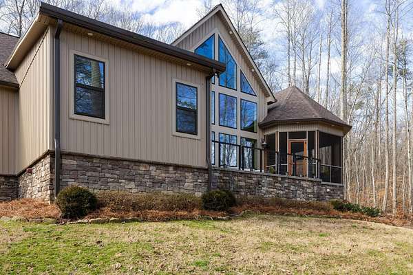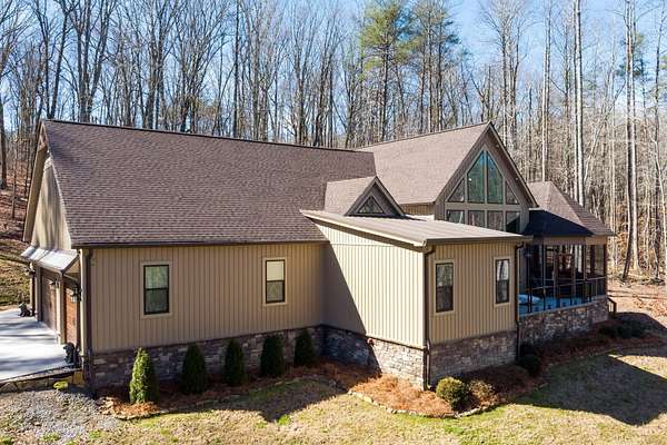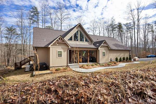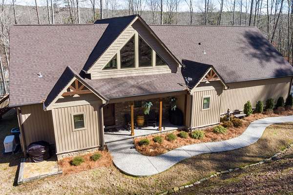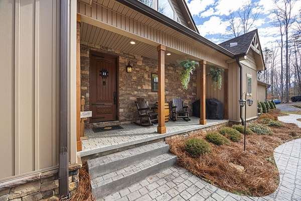 In the quiet, gated community of Mountains Farms, you will arrive at a gorgeous all custom home on 10.81 wooded acres overlooking the community's private lake. As you approach the drive, you will be greeted by the brand new 1200 sq ft heated, cooled, fully insulated detached garage designed to match the home perfectly. Landscaping is mature and beautiful rock accents compliment the stamped concrete sidewalk and porches. Outside you can enjoy the warmth of the slate stone firepit, take a soak in the hot tub, or cast a line from your private, lighted dock at the water's edge. A slate stone cooking area is located outside for grilling and around the corner from the full house Generac generator.