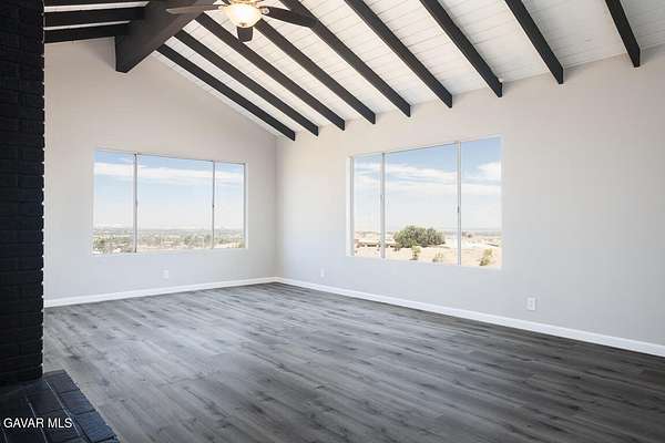 Freshly updated and move-in ready, this 3-bedroom, 2-bath home offers a rare opportunity to own a view property with a spacious 2,076 sq ft interior and nearly 3 acres of land. Situated on a quiet, private street, the home is anchored by a striking second living room with vaulted ceilings, a dramatic brick fireplace, and wall-to-wall windows that frame panoramic canyon and city views. The kitchen has been tastefully updated with white shaker cabinets, quartz countertops, stainless steel appliances, and new flooring. The layout offers both utility and flow, with the entry opening to a spacious front living room. Toward the rear of the home, the kitchen and formal dining room connect seamlessly to the show-stopping second living area. Down the hall are three generously sized bedrooms and two full baths. The primary suite features an ensuite bathroom. The private hillside setting--with sweeping vistas that stretch for miles--is composed of two separate parcels, both included in the sale - rare and scenic retreat.