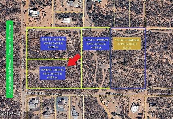 PRIME LAND! Rio Verde Foothills: 4.2 ACRES, APN #219-36-073 B. Bordering the Scottsdale McDowell Sonoran Preserve, and down the street from the Tonto National Forest! Beautiful, elevated, building site along preserve! Perfect for your dream custom home estate, or ranch. Builders, potential 4 lot split for spec. homes. Enjoy breathtaking, panoramic views of 4 Peaks, Granite Mountain, and other majestic mountain ranges. Water wells nearby. Refer to parcel map under the document tab of the listing for lot layout. Adjacent parcels for sale: