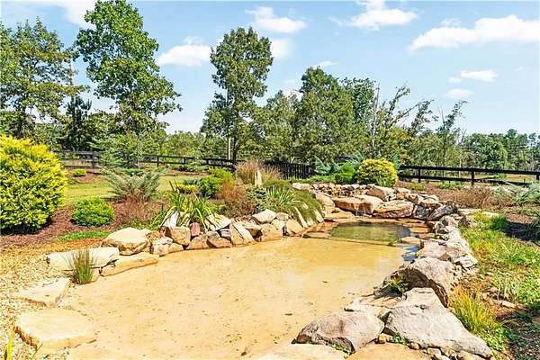 Enjoy lush, green pastures, a peaceful creek, and private trails for horseback riding -- and, with barrel racing next door for those who love the sport! And as if that weren't enough, there's a stunning pond and water feature with waterfalls, sitting rocks, and a beach-style area for relaxing on warm Georgia days.