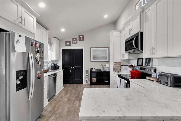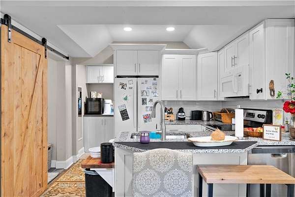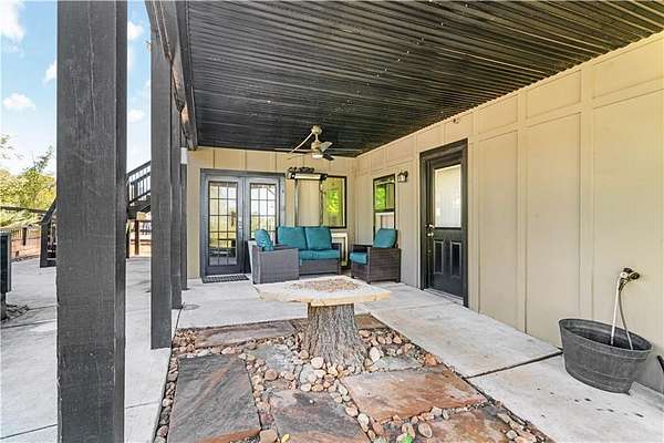 Upstairs, you'll find a bright and cheerful 3-bedroom, 2-bath home featuring a white kitchen with granite countertops, stainless-steel appliances, and a cozy keeping room anchored by a stone fireplace. The spacious family room opens to multiple decks overlooking rolling pastures, perfect for morning coffee or evening gatherings as the sky puts on a show.