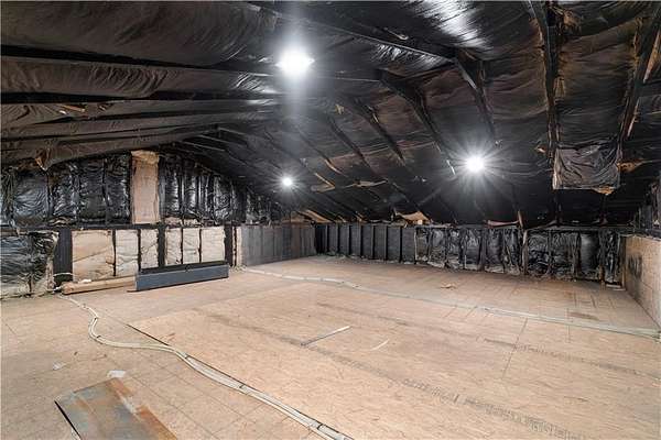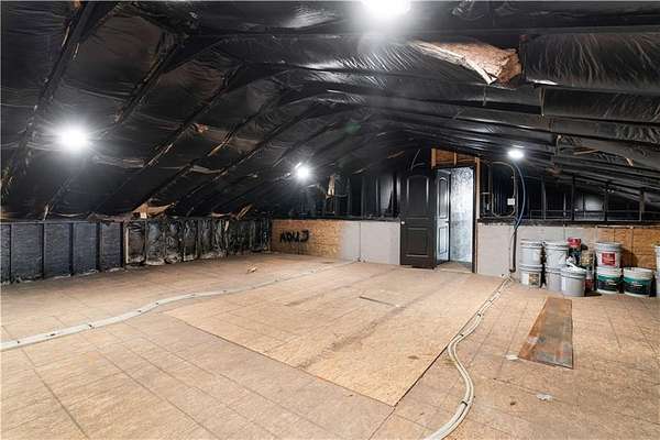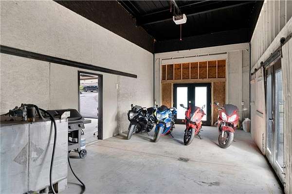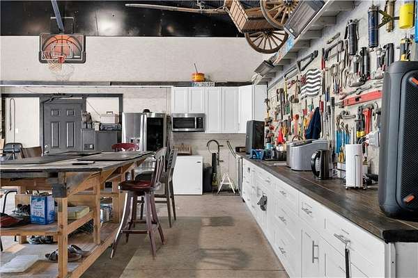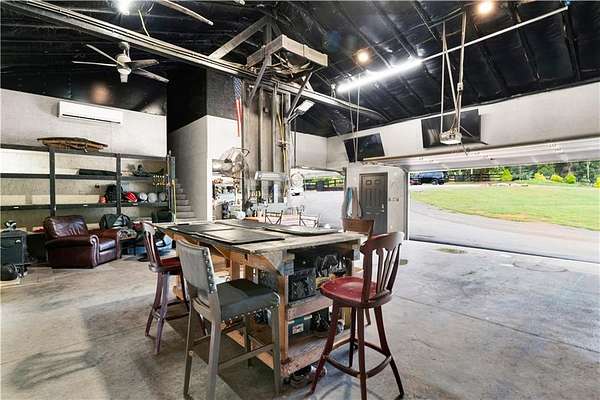 The massive workshop is a dream come true -- fully set up for work, hobbies, or entertaining with four garage bays, mounted TVs, storage, and even a hot tub area.