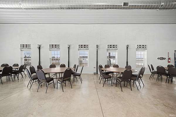 This nearly 8-acre property offers a fully built-out, turnkey event venue with approximately 5,600 square feet of indoor space and a capacity of up to 294 guests. Designed for high-volume professional events, the layout supports seamless flow for ceremonies, receptions, catering, and support operations. The property includes a transferable 3-way liquor license, significantly enhancing revenue potential. A prep kitchen, heavy electrical wiring for professional DJ and AV use, and an overbuilt septic system engineered for event capacity provide strong operational infrastructure. An outdoor patio with gas heating extends seasonal usability, and two paved parking lots with handicap accessibility offer convenient on-site parking. With the right offer, event furnishings and supplies, including tables, chairs, dishware, and linens, may be included, allowing a buyer to launch or transition operations quickly. Located approximately 30 minutes from Lafayette and 50 minutes from northern Indianapolis, this property offers both accessibility and privacy, making it ideal for destination weddings, corporate events, retreats, and private celebrations. In addition to event use, the building lends itself to alternative commercial applications such as a church, private club, conference center, showroom, or dealership, offering flexibility for investors and owner-operators alike. This is a rare opportunity to acquire a high-capacity, professionally designed venue property with strong infrastructure, zoning potential, and immediate usability. Business not included; real estate and improvements only.