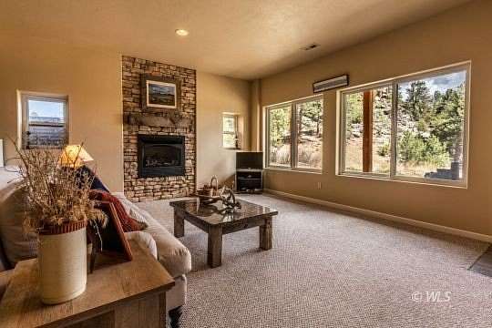 Embrace a serene lifestyle surrounded by nature's grandeur in this stunning residence. Tucked away in a gated community, this home offers tranquility with its lush alpine trees and awe-inspiring rock formations. Each of the four bedrooms presents breathtaking mountain vistas, ensuring a picturesque start to every day. Delight in the warmth of the living room's log fireplace or entertain in the family/game room featuring a gas fireplace, wet bar, mini fridge, and microwave. This property is not just a home but a lifestyle, ready for immediate move-in with stylish furnishings included. Spanning 2,880 sqft on a sprawling 38.36-acre lot, fire-mitigated for peace of mind, the home is built to impress with 2x6 construction and R38 insulation. A heated garage adds comfort and convenience. Wildlife enthusiasts will enjoy frequent sightings of elk, deer, and an array of birds. Don't miss out on owning a piece of mountain paradise! *Comes Furnished and Ready to Use*