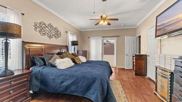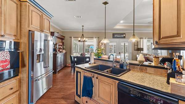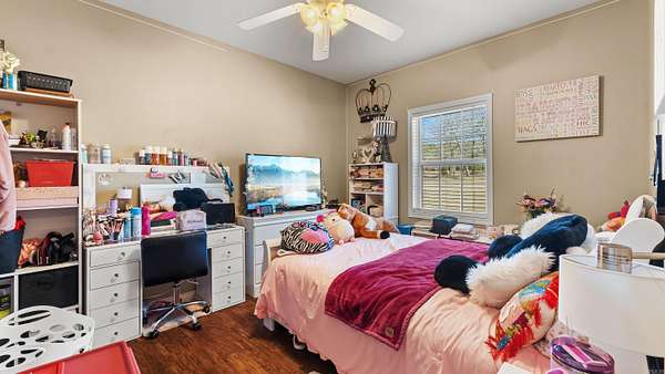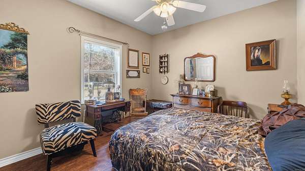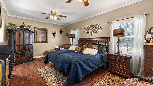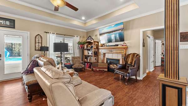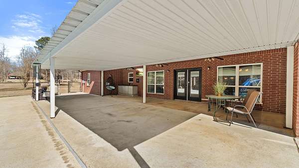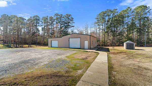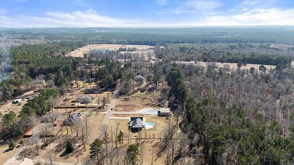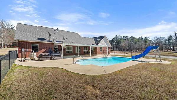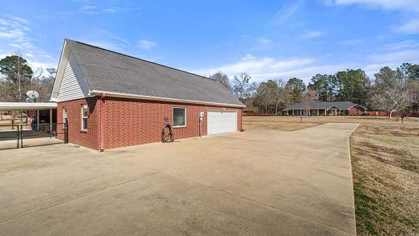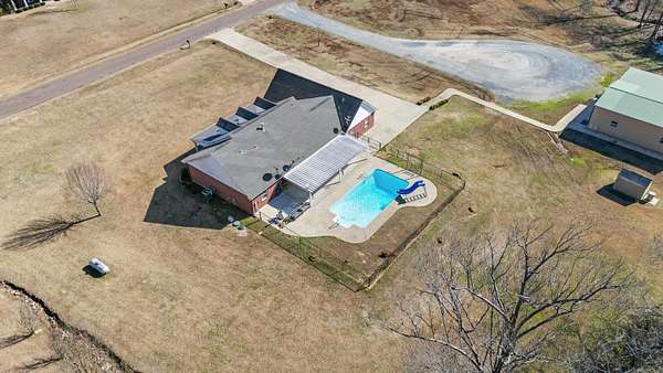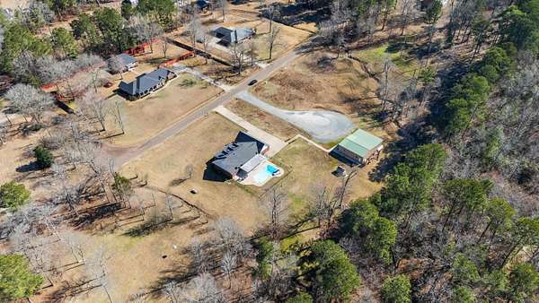 Welcome to your East Texas dream -- where peaceful country living meets everyday comfort. Nestled on approximately 4 acres just minutes from town, this beautiful 4/2 brick home offers over 2,100 sq ft of thoughtfully designed living space in a well-established neighborhood. A welcoming tile entry opens to an open-concept layout featuring formal dining, snack bar, and an inviting living room with cozy gas fireplace. Wood laminate flooring flows through the main areas, with tile in the entry and bathrooms for durability. The private primary suite is a true retreat with doors leading to a covered patio and sparkling in-ground pool with slide. Relax in the jetted tub with frosted privacy window and dual vanities. Outdoors, enjoy extensive concrete decking, added pool fencing, a peaceful creek, and a huge shop with its own driveway -- perfect for hobbies, storage, or business use. Additional highlights include wood blinds, spacious laundry room with folding table, two-car garage, gas line for dryer, and recent 2025 updates including water heater, cooktop, microwave, garage door opener, and septic servicing. If you've been searching for acreage, privacy, and a move-in-ready home!