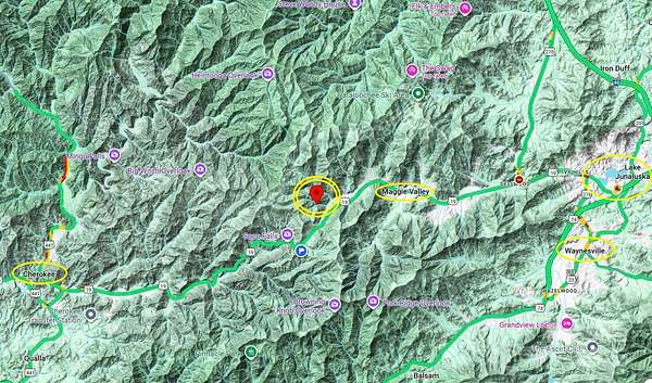 From Hwy 19 (Soco Rd), turn onto BLACK CAMP GAP RD, then left onto HIDDEN COVE RD. Continue straight to MOONSHINEHOLLER RD. 355 Moonshineholler is on the right.