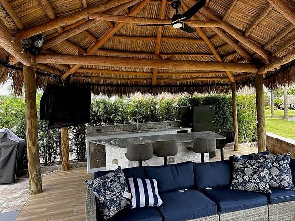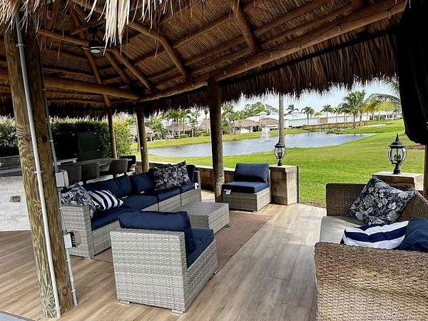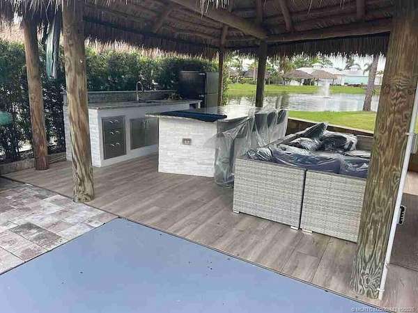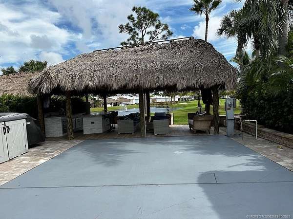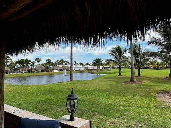 Prime Lakefront Lot with Golf Course Views - Fully Furnished! Beautifully located near the clubhouse, main pool, sports facilities, and dog park, this stunning lot offers both luxury and convenience. The spacious tiki features a galley-style kitchen with ample storage and a stylish stone facade, perfectly blending function and design. Fully enclosed with Eisenglass curtains for year-round comfort, it's ideal for entertaining or relaxing. Mature landscaping provides privacy while framing gorgeous lake views with a lighted fountain and scenic golf course complete with a charming wooden bridge. Enjoy breathtaking sunrises over the fairway and unwind in your private outdoor oasis. Sold fully furnished-just bring your coach and start living the resort lifestyle at Motorcoach Resort St. Lucie West!