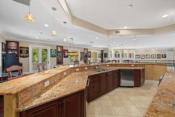- Cathedral Ceiling(s), Ceiling Fans(s), Central Vaccum, Crown Molding, High Ceilings, Primary Bedroom Main Floor, Split Bedroom, Stone Counters, Thermostat, Walk-In Closet(s), Wet Bar, Window Treatments