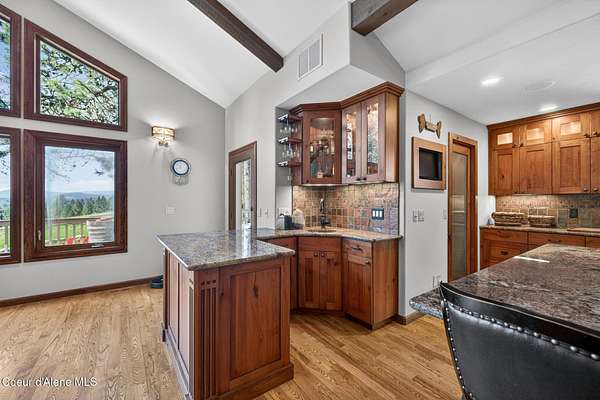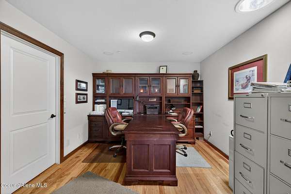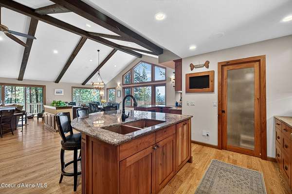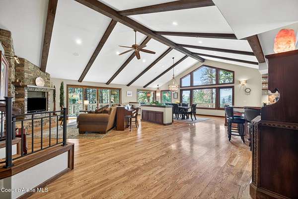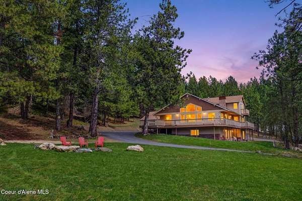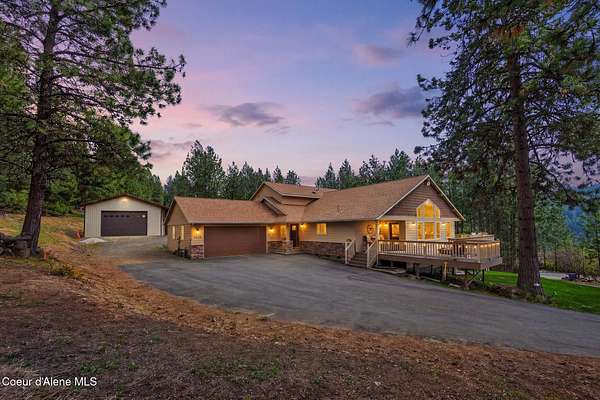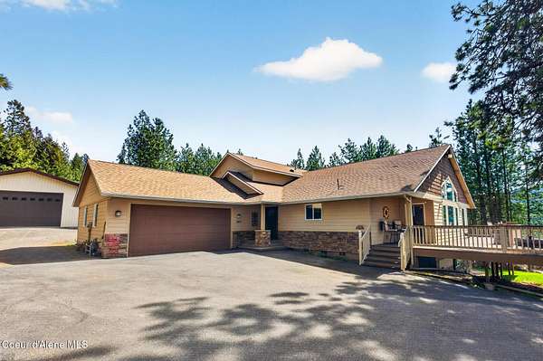 Experience the ultimate North Idaho lifestyle on this sprawling 2.5+ acre estate, offering sunset views of Lake Coeur d'Alene and total privacy - all just 5 minutes from downtown. This custom built four-bedroom, 2.5-bath residence welcomes you with vaulted ceilings, expansive living spaces and a warm gas fireplace. The kitchen is a chef's dream, featuring endless counter space, a walk-in pantry, and a dedicated wet bar for seamless entertaining. Retreat to the main-floor primary suite, where private deck access and a convenient adjacent laundry room offer effortless living. Below, a partially finished basement includes a private-entrance studio apartment - perfect for guests or rental income. Outside, the massive wrap-around deck overlooks a manicured lawn and mature trees framing the lake. Car enthusiasts and hobbyists will love the insulated 30x40 shop, covered RV port and full RV hook up. With the rare potential to add a second residence, this is more than a home, it's a legacy property.