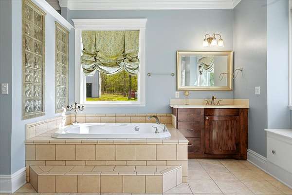 - Carpeting, Ceiling Fan, Hardwood Floors, High Ceilings, Partial Curtains, Satellite Dish, Shades/Blinds, Smoke Detectors, Tile Flooring, Whirlpool Type Tub