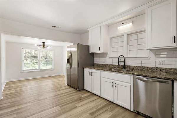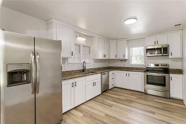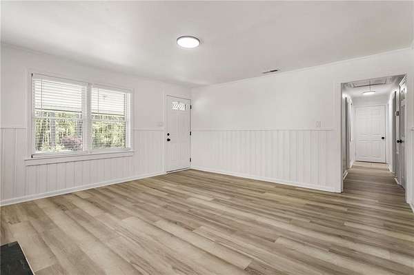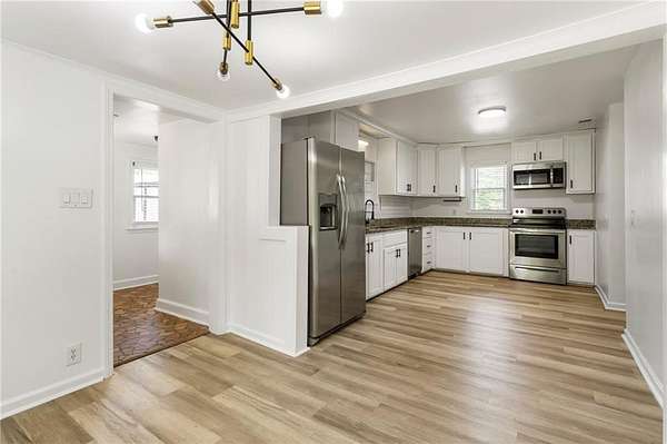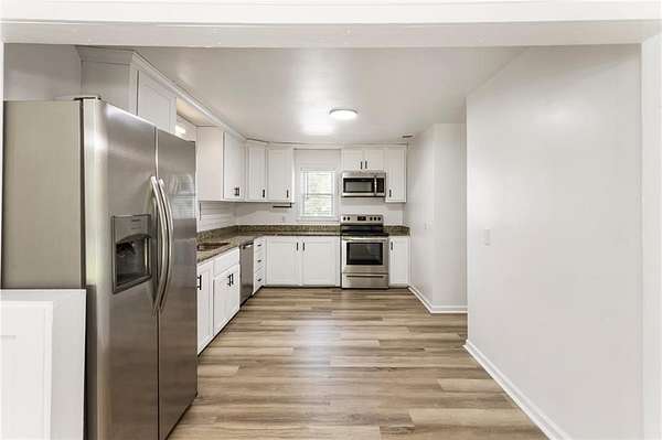 Investor!!! house is leased for $ 2,140 Keep the house leased and use the land. Don't miss the opportunity to own this beautifully remodeled home situated on 1.66 acres of level land, featuring a fenced backyard and a spacious covered area at the back, perfect for your business or entertainment needs This charming house includes 2 bedrooms, 1 bathroom, and a large kitchen that opens seamlessly into the dining room. Additionally, there is a laundry room and a cozy living room. The entire home boasts vinyl flooring, with the exception of the bathroom, which is elegantly tiled and includes a shower. In front of the house, you will find a welcoming porch and ample parking space, ideal for friends and family to enjoy their time together. Conveniently located just 5 minutes from shopping, schools, entertainment, and highways, this property offers great potential. The lot can be subdivided, provided it adheres to the zoning requirements for R30 in the City of Powder Springs. Transform this property into your dream home or a lucrative rental income opportunity.