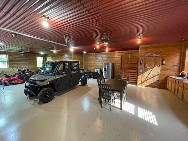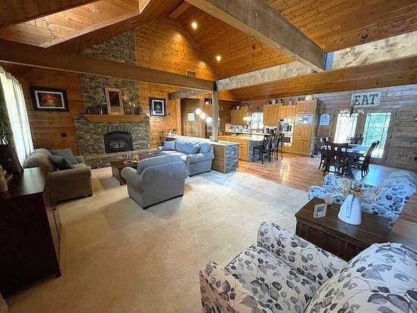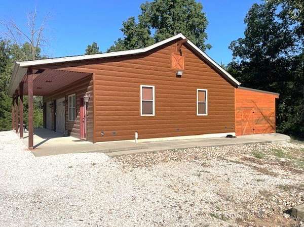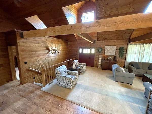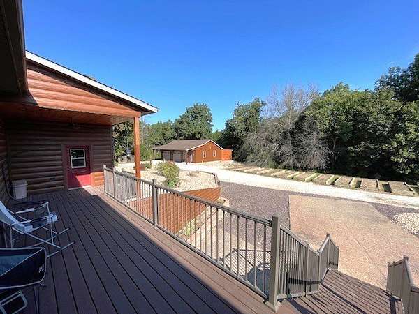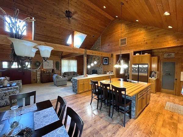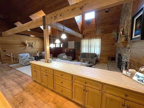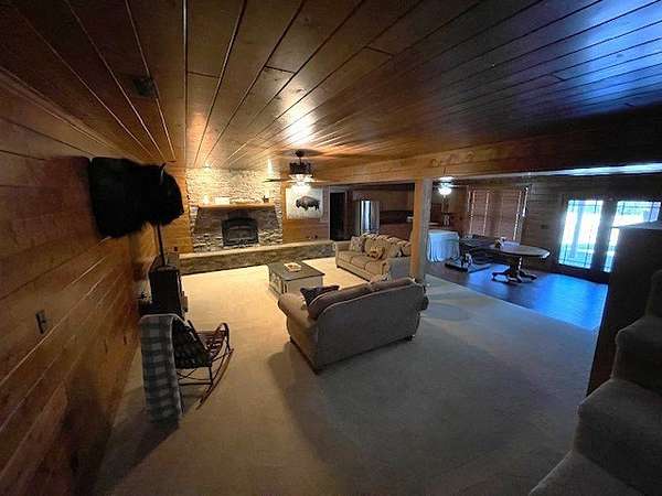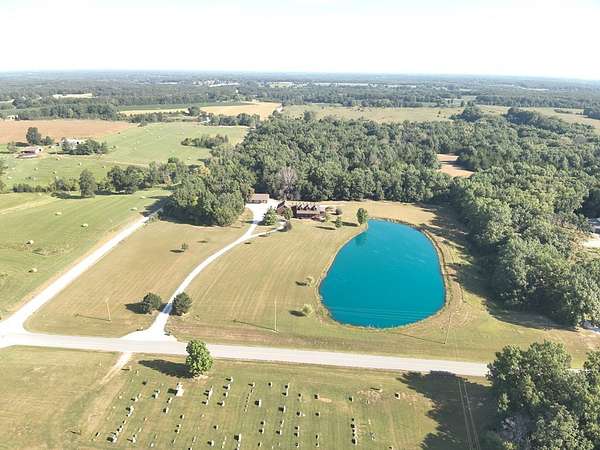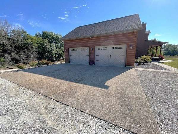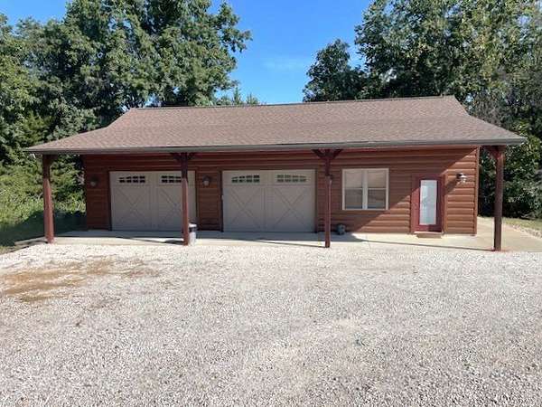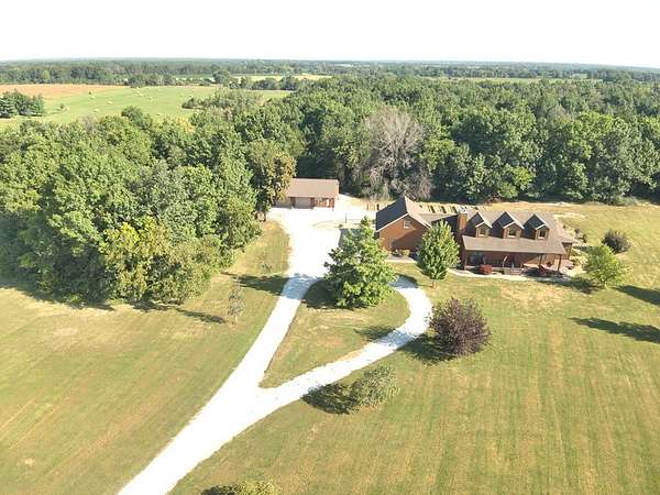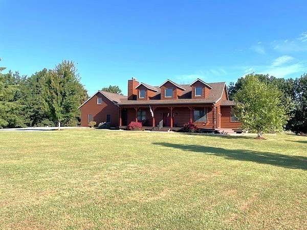 Est $3,677/moCustom lodge-style home on 8.4 acres with a 2-acre stocked pond. Features Amish-milled wood siding, vaulted ceilings, quartersawn cabinets, butcher block countertops, and rock fireplaces. Finished basement includes extra living space, kitchenette, 2 bedrooms, and a bath. Heated/cooled 32x28 garage and 48x30 shop with bath and kitchenette. Recent updates: TruLog metal siding, composite decks, and high-impact roof. Easy access to Macon and Moberly.