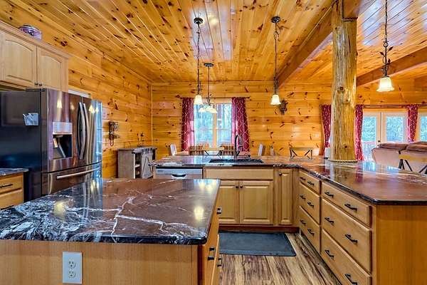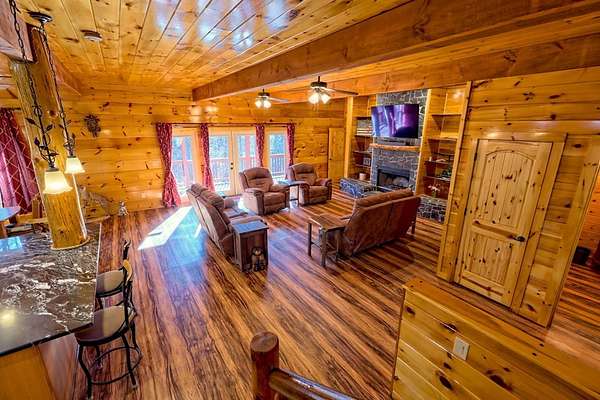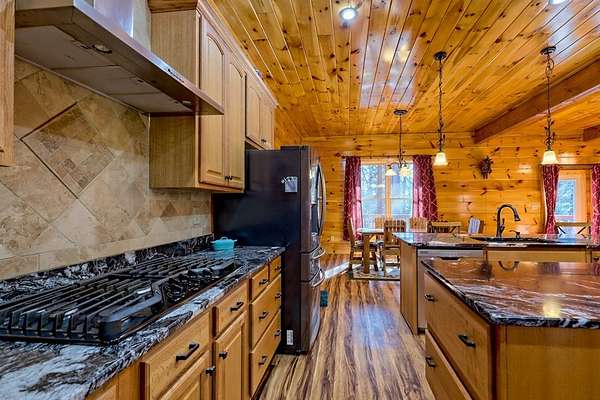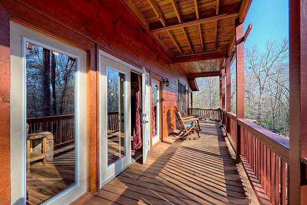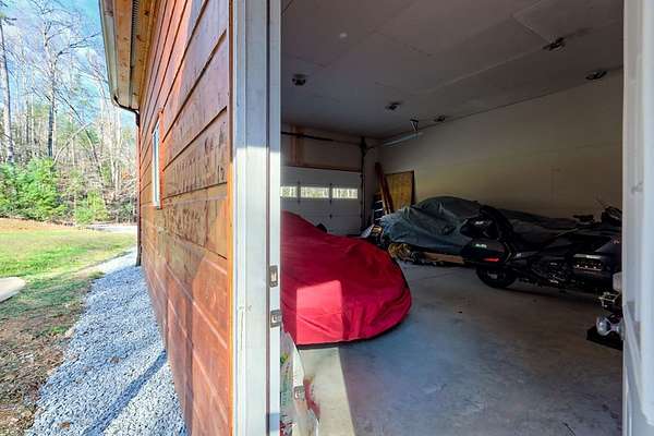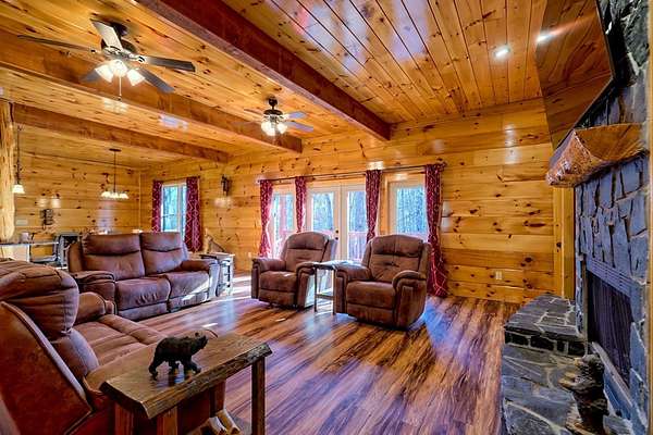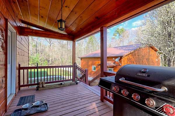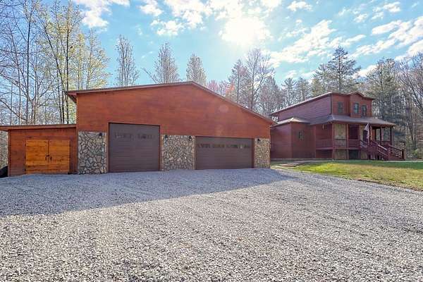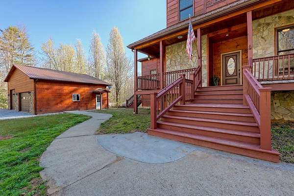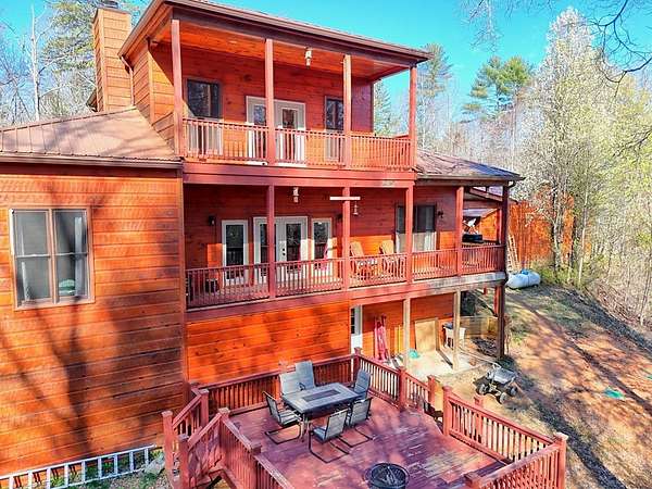 Experience refined mountain living in this exceptional 4-bedroom, 3-bath estate, gracefully tucked amid 5 pristine acres in the heart of the Blue Ridge Mountains. Designed to capture the essence of elevated rustic luxury in one of Blue Ridge's most coveted settings. Inside, dramatic vaulted ceilings and expansive windows bathe the living spaces in natural light, framing breathtaking mountain views. The great room centers around a majestic wood-burning fireplace with a gas starter, while the gourmet kitchen showcases exquisite craftsmanship with wood milled directly from the property and nearly new, high-end appliances. The primary suite on the upper level serves as a private sanctuary, complete with a covered deck ideal for quiet mornings or candlelit evenings. Two additional bedrooms and a full bath on the main level offer elegant comfort for family or guests, and the lower level—partially unfinished—presents the perfect blank canvas for a bespoke wine cellar, media room, or spa retreat. Designed for seamless indoor-outdoor living, the residence features a sweeping covered wraparound porch and a 1520 open-air BBQ deck, ideal for hosting intimate gatherings or memorable celebrations. Complementing the home's design are a spacious detached garage with a workshop, ample outdoor storage, and two covered concrete carports. Every detail of this mountain retreat speaks to quality, serenity, and sophistication—an exquisite fusion of natural beauty and modern luxury in the heart of Blue Ridge.