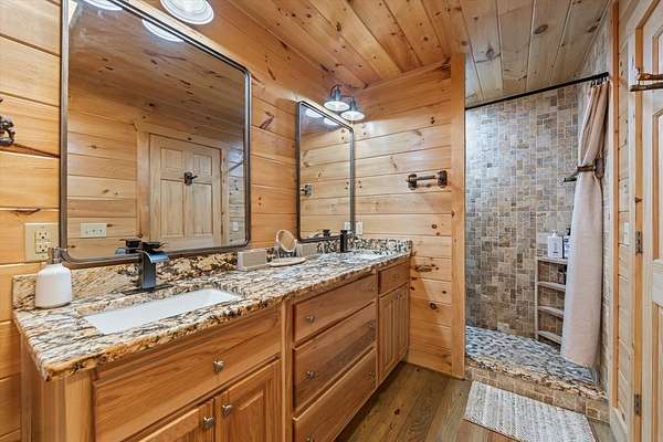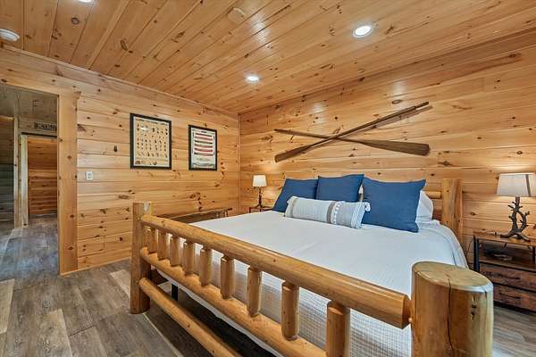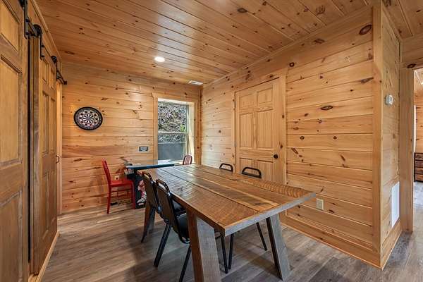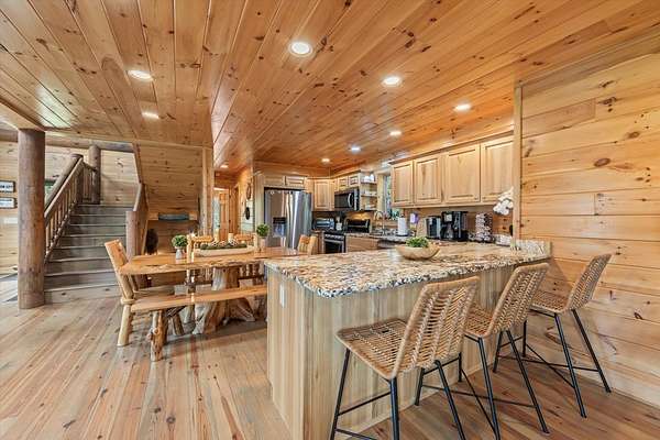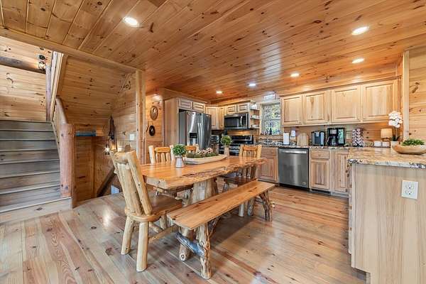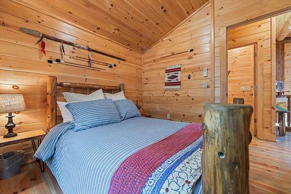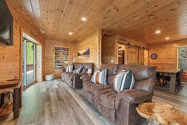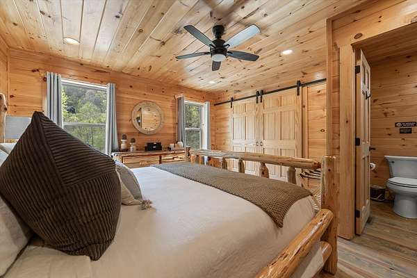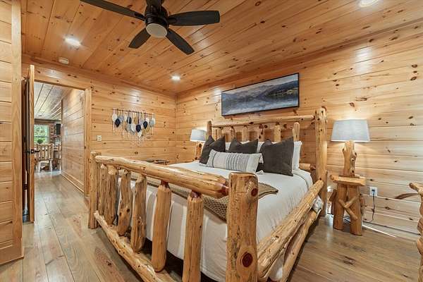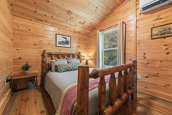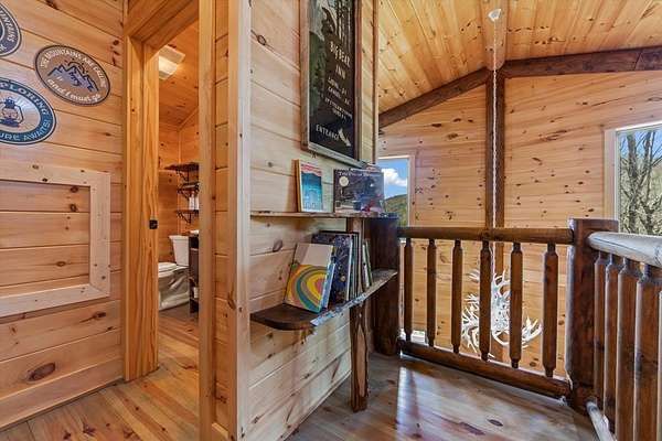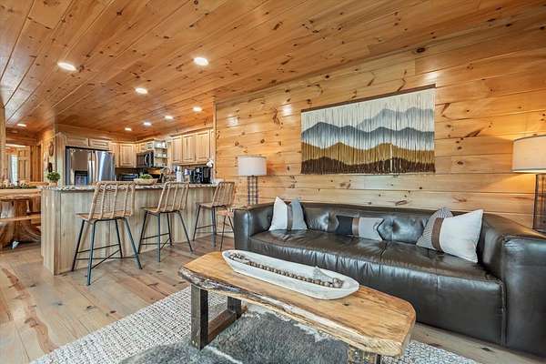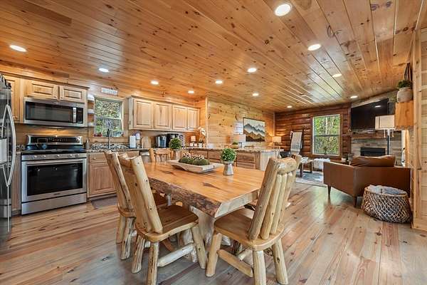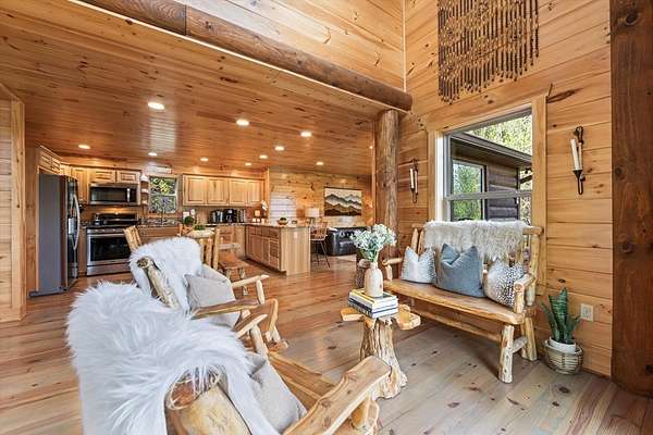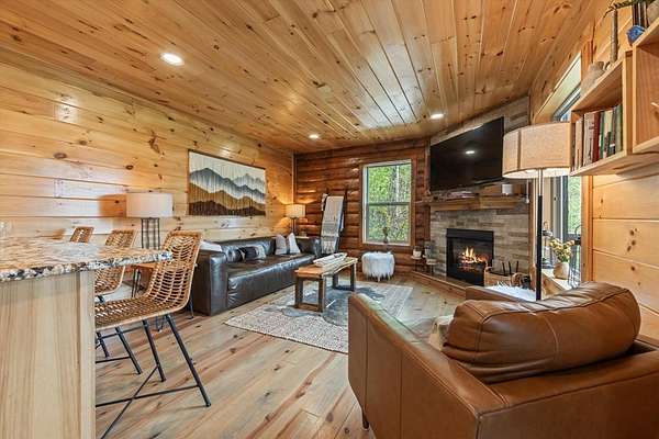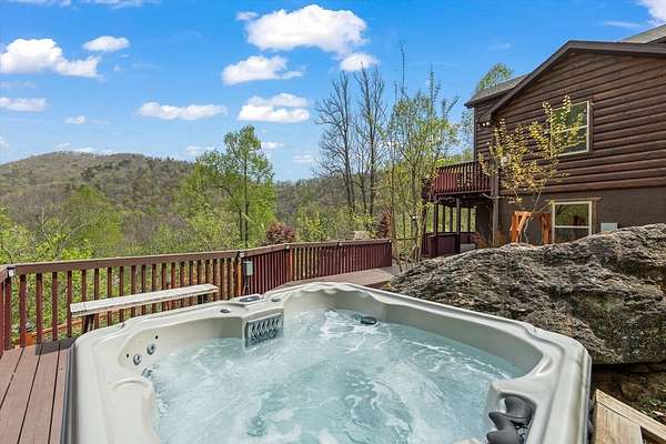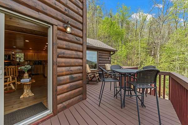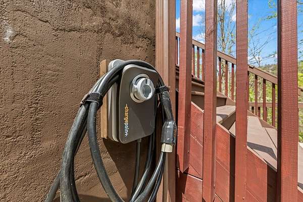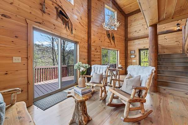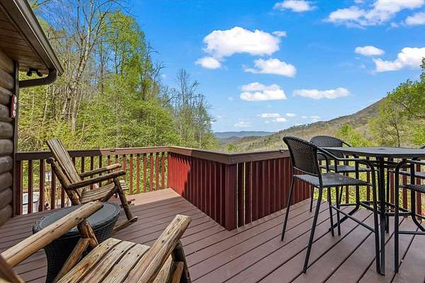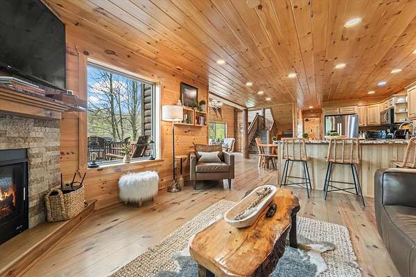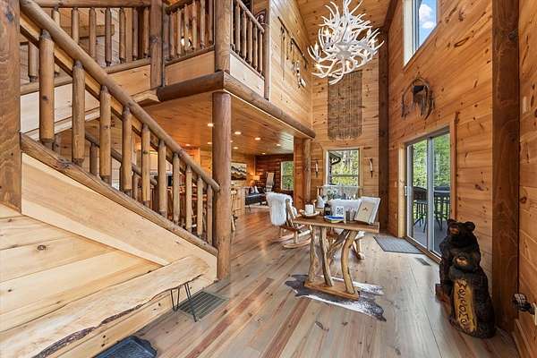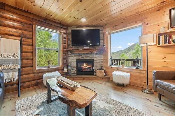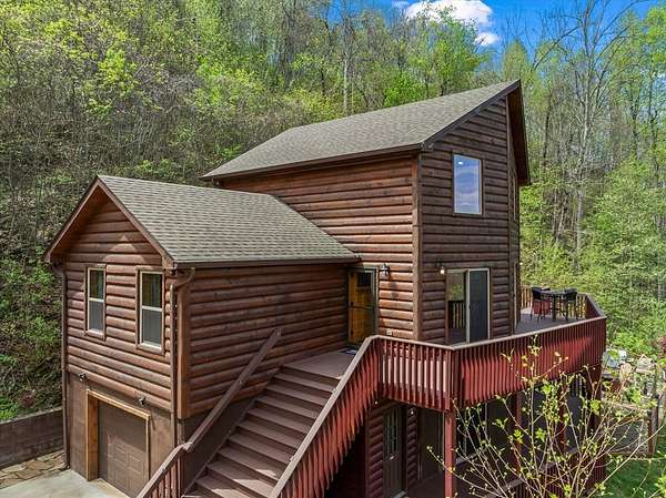 Mountain views and mountain charm come together in this inviting log home featuring 3 bedrooms and 2.5 bathrooms across a thoughtfully designed 1.5-story layout with a finished basement. The main level offers a spacious primary bedroom with an en-suite bath, along with a comfortable living room and lounge area centered around a cozy gas log fireplace. The upper-level features two additional bedrooms and a full bathroom, ideal for family or guests. The lower level expands the living space with a large recreation room, dining area, half bath, and a bonus room currently used for additional sleeping, providing excellent flexibility. Enjoy the convenience of a 1-car attached garage with an EV charging station. Step outside to your own outdoor oasis, complete with a hot tub, swing, firepit, and grilling area-all perfectly positioned to take in the mountain views. A great option for a full-time home, second home, or investment.