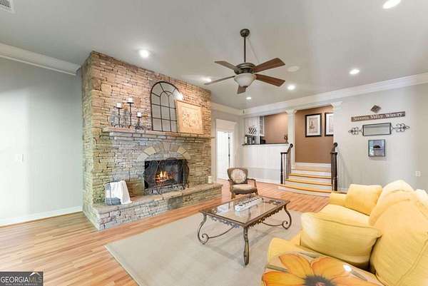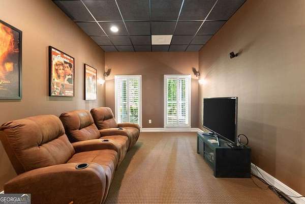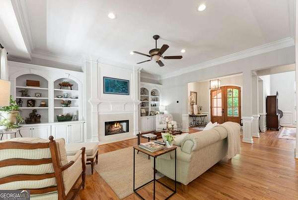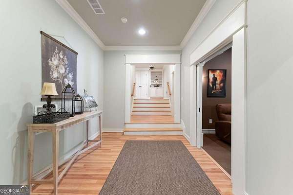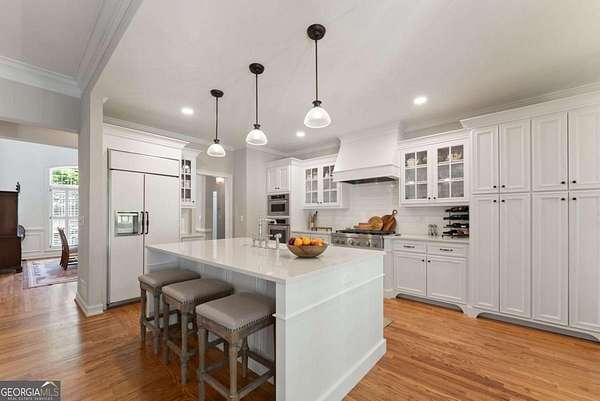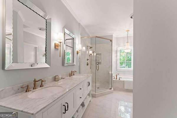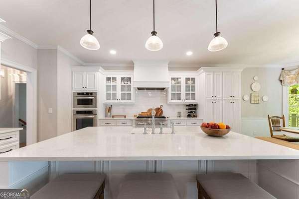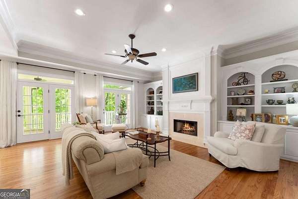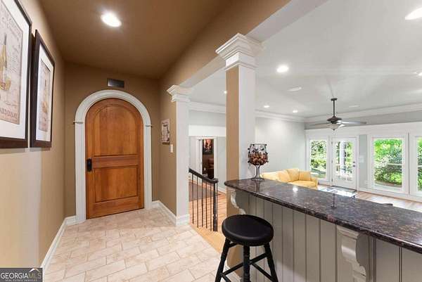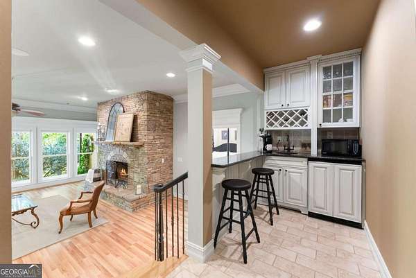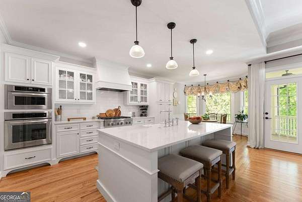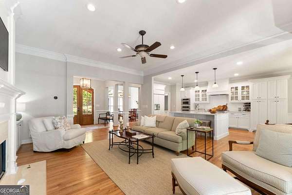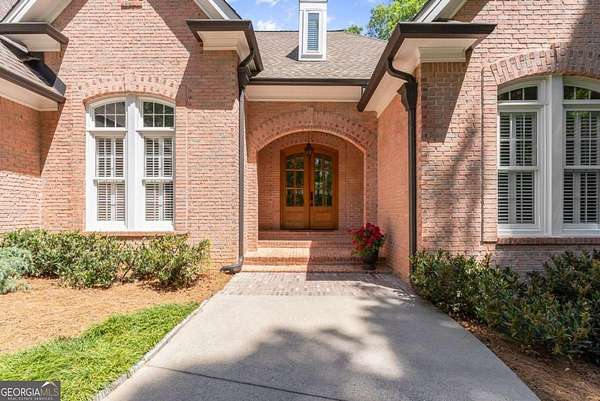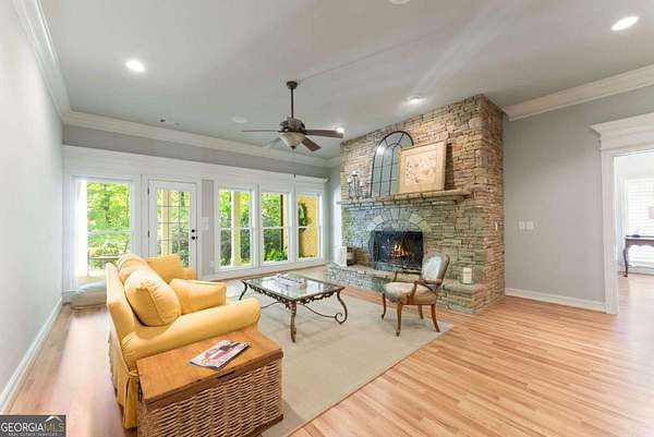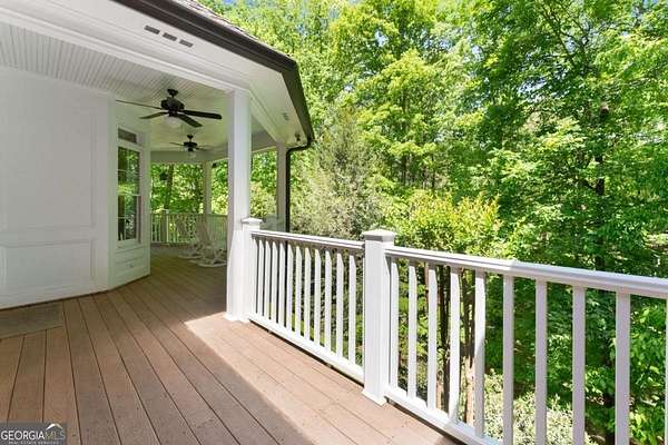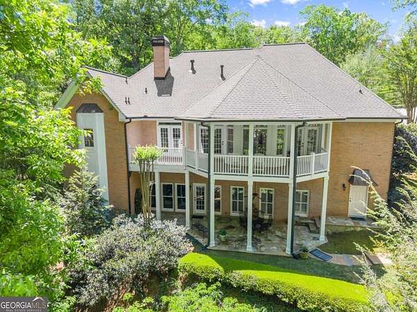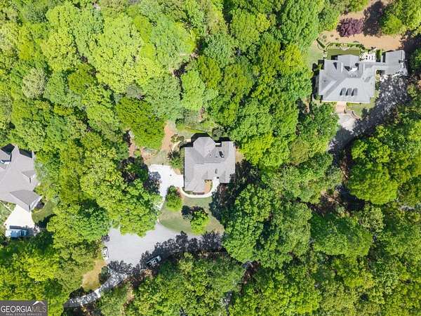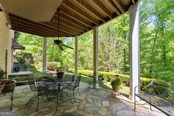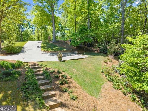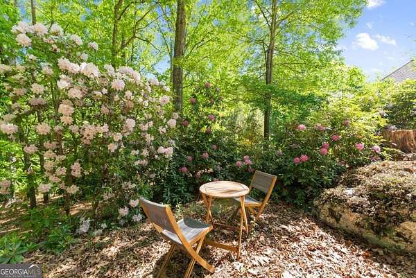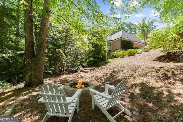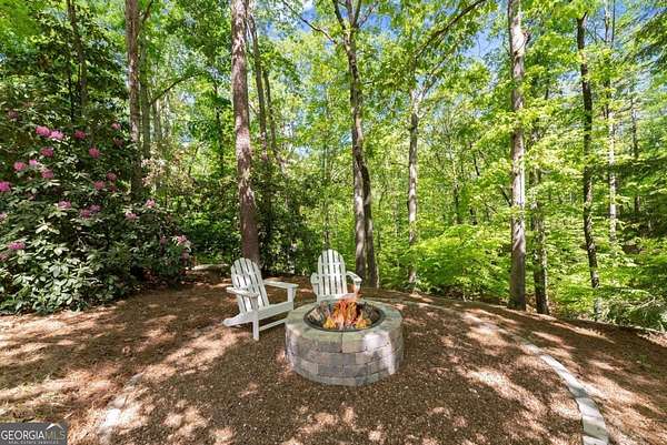 Homes with this combination of land, location, and layout are rarely available. The floor plan alone sets the tone. Designed for ease and longevity, the ranch layout places the primary suite on the main level alongside two additional bedrooms and bathrooms - an increasingly rare configuration. The home has been thoughtfully updated throughout, with full kitchen and bathroom renovations that reflect timeless, classic design. The kitchen features quartz countertops, KitchenAid appliances, and custom cabinetry, opening into light-filled living spaces anchored by a fireplace in the main living room - a natural gathering point for everyday living and entertaining. A second primary suite on the terrace level - complete with high-end finishes and a fireplace - adds flexibility for guests or multigenerational living. The finished terrace level also includes a theater room, den with fireplace, kitchenette, an additional laundry hookup, and abundant storage. The grounds are where this property earns its place. Set on over three acres, the land has been carefully shaped into a private sanctuary with walking and biking trails that lead to a creek feeding a peaceful pond. Mature landscaping and natural wildlife create a sense of retreat that's genuinely hard to find this close to town. Minutes from Gainesville, Lake Lanier, and Chattahoochee Country Club - private acreage with none of the tradeoffs.