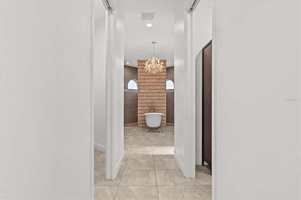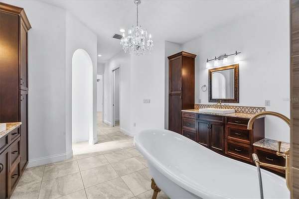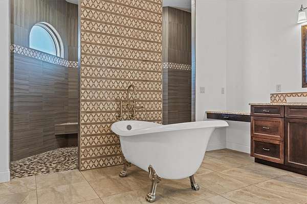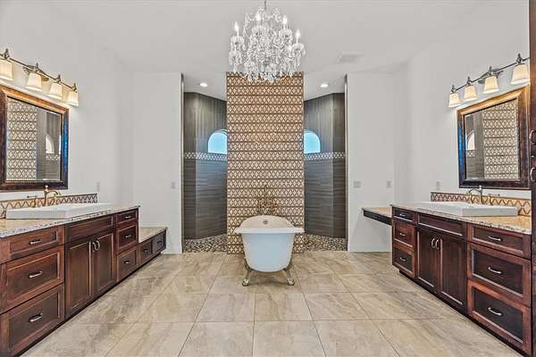 The primary suite feels like a true retreat with dual walk-in closets, a clawfoot soaking tub, dual vanities, and a spacious walk-through shower. There are also three additional bedrooms (one with French doors that can double as an office) and three full bathrooms.