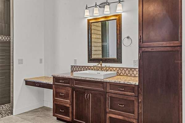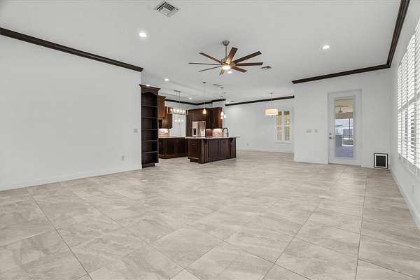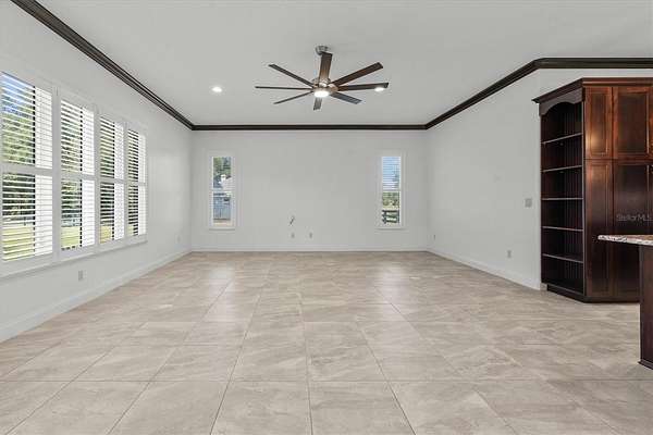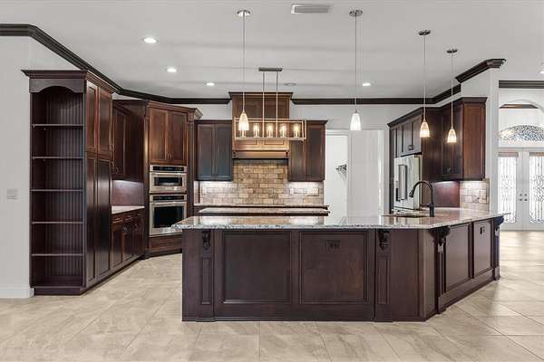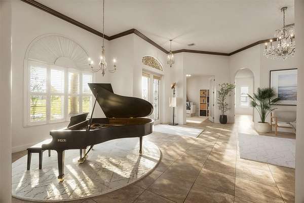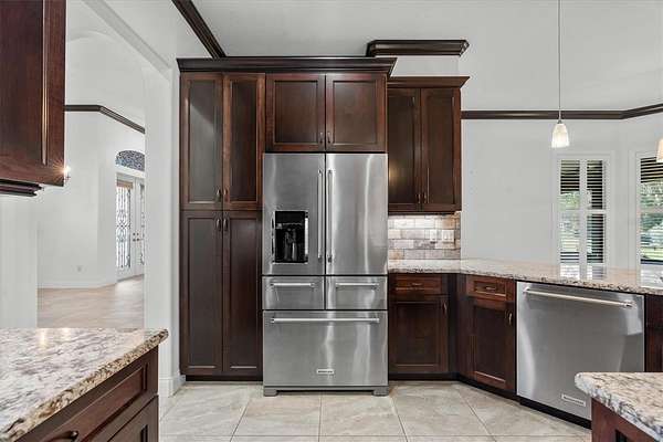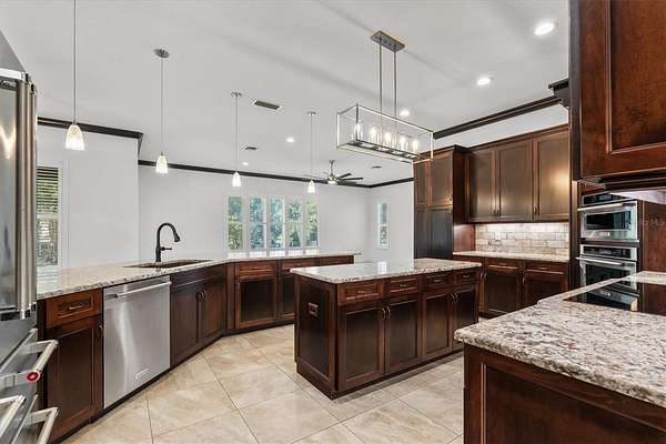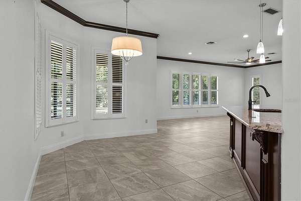 Inside, you'll find 3,209 square feet of thoughtfully designed living space with high ceilings, crown molding, plantation shutters, and 20" Italian ceramic tile throughout. The gourmet kitchen is a showstopper with KitchenAid appliances, a huge center island, granite countertops, dual pantries, and plenty of storage.