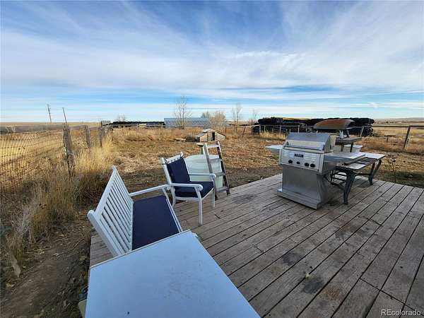 Cozy home on 60 acres in Elbert County Colorado. 1 spacious bedroom with walk in closet and a beautiful bathroom with large tub and separate walk-in shower. The tile work and 9 in. wide luxury vinyl plank flooring are well done & easy to maintain. This comfortable home was designed with efficiency in mind and can be lived in year round with net $0 in utilities. The solar panels are paid for and included with the sale. You'll enjoy the open floorplan, great sunlight, wood burning fireplace, high efficiency electric boiler and cool minisplit air conditioning. Outside you have a 2 car detatched garage and a separate home office or ADU(heated/cooled) with a walk in freezer just large enough to hang your beef or wild game. The property is well fenced with 4 strand barbed wire and t-posts and has great terrain to pasture, cultivate, ride or roam with seasonal ponds and great native grasses. There are multiple outbuildings for all your workshop, tack room, storage or stable needs including a 25x60 Earth Sheltered Solar Greenhouse and a 10x12 chicken coupe with automatic door. The property also includes an approximately 150x150 arena + coral and alley built of approximately 1200 tire bales that are practically indestructible and can be moved with a skid steer into any configuration you need to protect your most prized livestock. The tire bales are also great for shooting backstops, erosion control, retaining walls and windbreaks. Come and enjoy your own private country get away today!