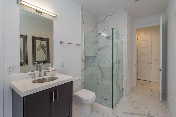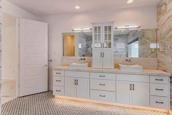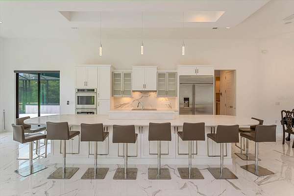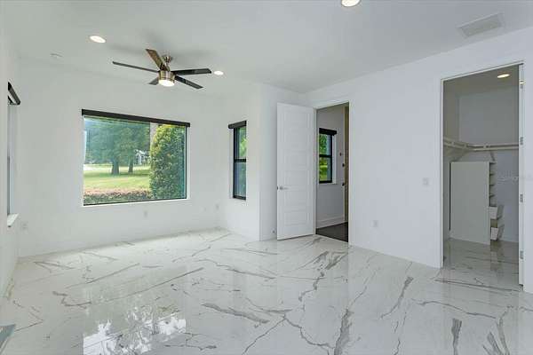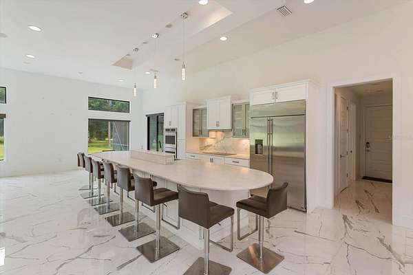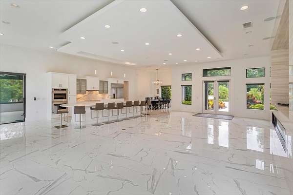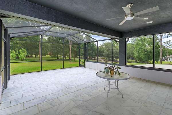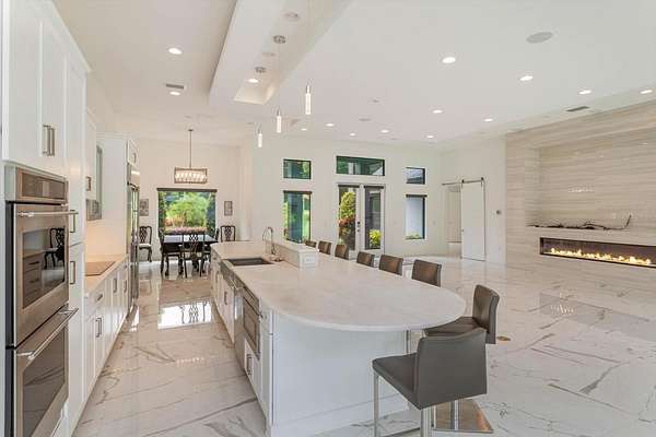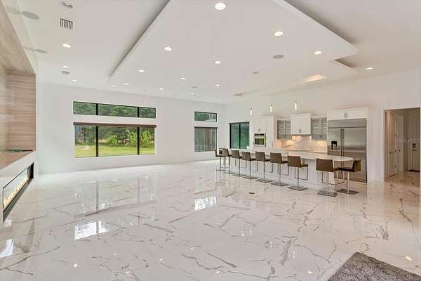 A unique Community in that you can have multiple out buildings such as car collector garage, guest house, barn, etc. Existing 4 car garage built with extremely high ceilings for 8 cars in total or A/C mezzanine space and/or storage. Light and bright, open concept, transitional home, to include equestrian uses allowed. Home has 4 bedrooms and 4 baths the primary bath flooring is Italian mosaics with modern open shower and tub and the bedroom has exterior private walled courtyard for sunning or plants. The extremely large family room/kitchen combo is anchored by a custom fireplace with led lighting and surround sound. Innovative cloud ceilings with led lighting and level 5 drywall. Kitchen includes top of the line appliances with stone bar seating for 10+. Carrera porcelain throughout entire home. Hybrid hot water system, concrete drive was constructed with the ability to entertain a large gathering of guests and also accommodate RV Parking in rear of home. Home is ready for pool as was designed for when built. Home is priced at the appraised value!!