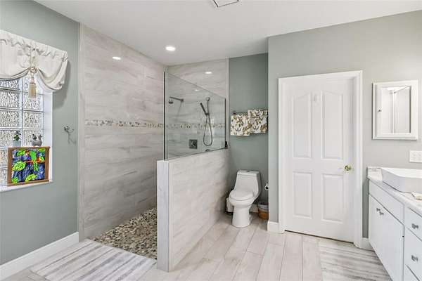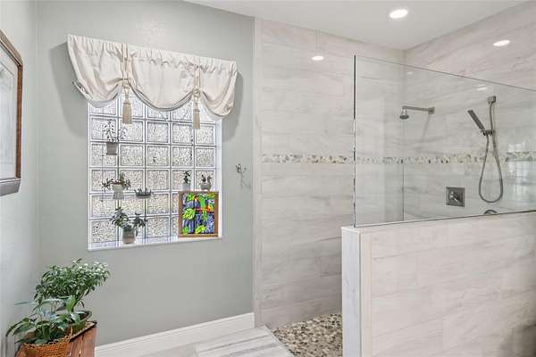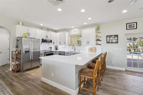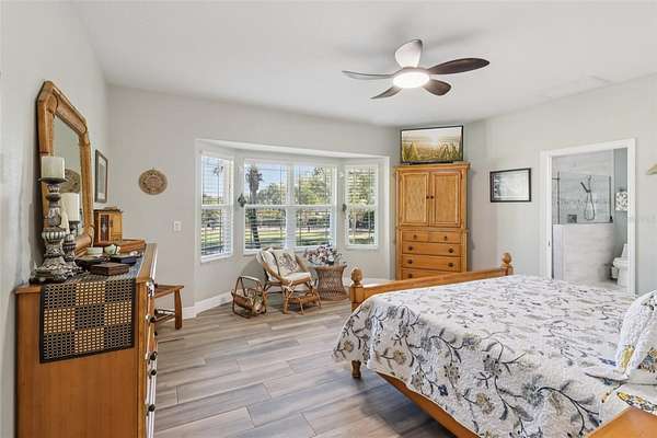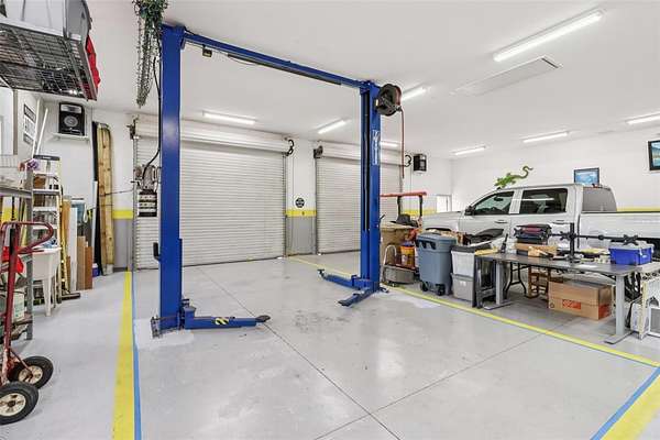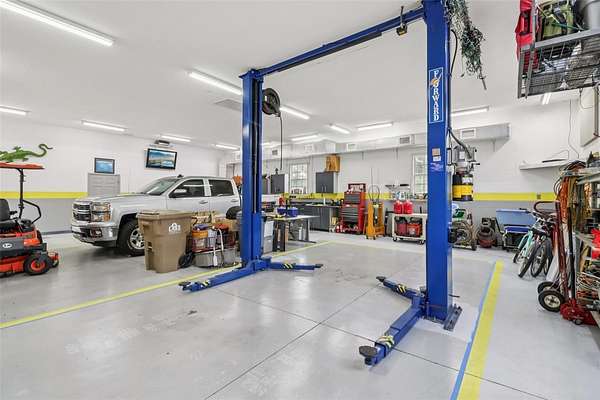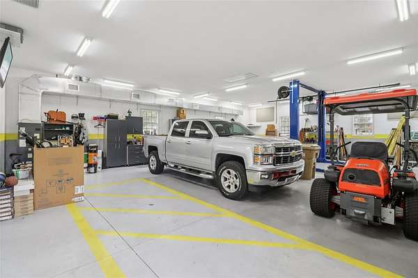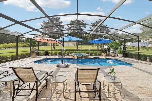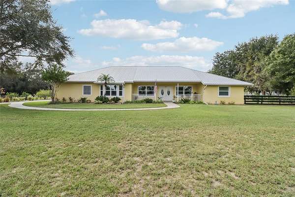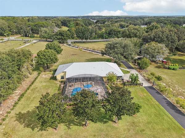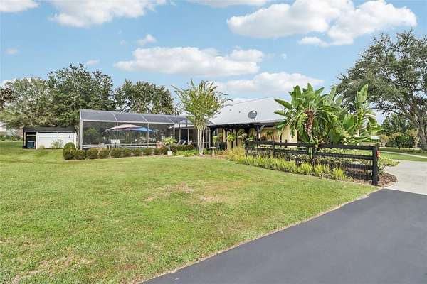 1/1 BONUS SUITE in the DETACHED"CLASSIC CAR BUILDING". New Roof 2018' -Double Front Doors welcome you into this amazing living area with split floorplan showcasing porcelain tile floors throughout. The updated kitchen has a spacious walk-in pantry and is open to the living/dining area and overlooks the lanai, firepit, and pool, making this the perfect gathering place for family and friends. The amazing quarts countertops and backsplash complement the solid wood cabinets with drawer storage, walk in pantry, stainless steel appliances and recessed lighting. (microwave, range & frig in utility room do not convey) The warmth of light "wood look" porcelain floor tile throughout this home adds to the natural light and invites all to enjoy the space. Kitchen floor being replaced with the matching porcelain tile in living areas prior to closing. The split floorplan offers privacy as well as functionality for family or guests. The beautiful primary suite has spacious walk-in closet, large ensuite bath, walk in shower, quartz counters with dual vessel sinks and extra countertop decorator cabinets for additional storage. Conveniently located, the large utility room includes utility closet with utility sink, and extra cabinets extra storage with outside entrance for lanai for easy access. Enjoy the sunsets and just relax in the paver deck area around your SCREENED POOL and HEATED SPA with Fire Pit and Country Kitchen/BBQ space. Can't forget to mention the landscaped Pergola walkway out to the drive and entrance to garage. Green thumb? No problem, this home also includes your own greenhouse just waiting for your touches. This beautifully designed and meticulously maintained landscaped property affords many opportunities. The 2.22 acres are fully fenced and include the electronically operated iron security gate. GOT HORSES? Plenty of room for pastures and an additional barn or building. The" CLASSIC CAR BUILDING" includes the BONUS SUITE with separate living area, full bath, and bedroom with luxury plank vinyl flooring PLUS the "Car Guys Dream Garage" with Electric Car Lift, Air Compressor with Outside Tank, Led Shop Lights and Storage Cabinets.