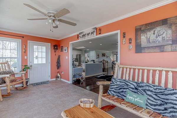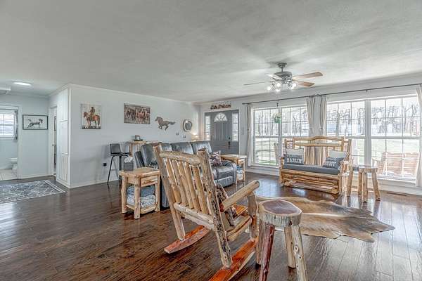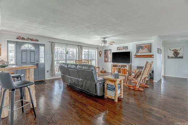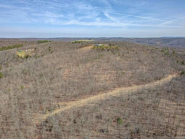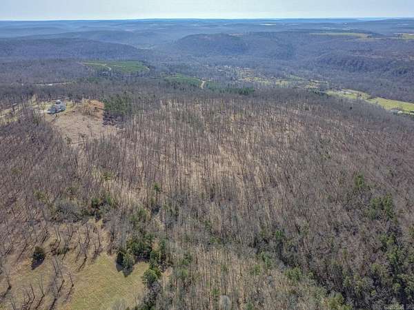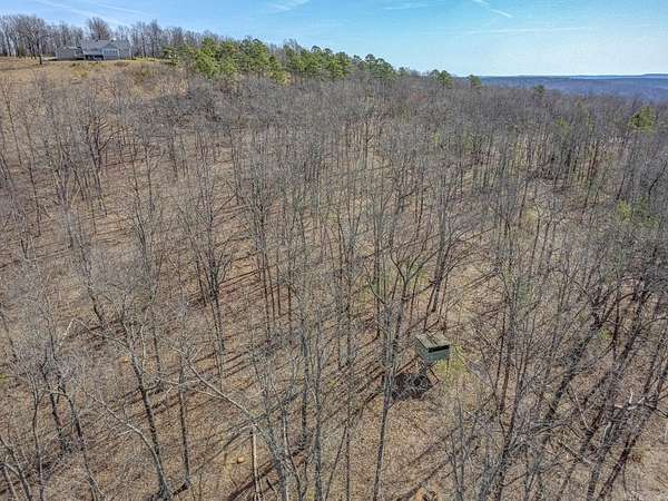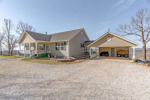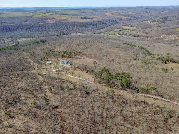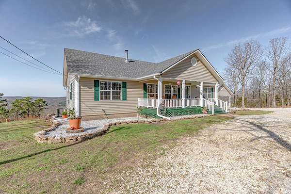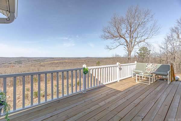 Sitting at the very top of the mountain with total privacy/no neighbors in sight. This breathtaking 38.36+/- acre Ozark retreat offers panoramic views for miles. The outdoor paradise includes ATV trails, deer box blind, wet-weather creek, pond, garden, & perimeter firebreak. Wildlife: including deer & turkey roam the vast majestic landscape. The 392 sf studio cabin w/bath & kitchenette is ideal for guests, office, or rental income. The 2-Bed, 2-Bath 2,016 sq ft home has an open-concept living, beautiful hardwood floors, spacious living room w/cozy pellet stove. Kitchen offers stainless steel appliances 2024/25, opens to four-season sunroom w/walls of windows showcasing the natural beauty of the Ozark Mountains. Relax on the spacious covered front porch or soak in stunning expansive views from the newly rebuilt back decks 2025. The private master suite features: walk-in closet, walk-in shower, dual vanities, & whirlpool tub. Additional highlights: Spacious utility room, architectural shingle roof 2023, gutter system 2025, high-efficiency HVAC 2024, & fiber internet. Custom log furnishings & additional furnishings may convey at an additional value. Contact listing agent for details.