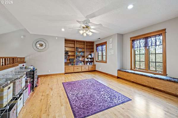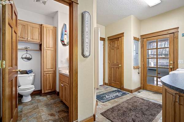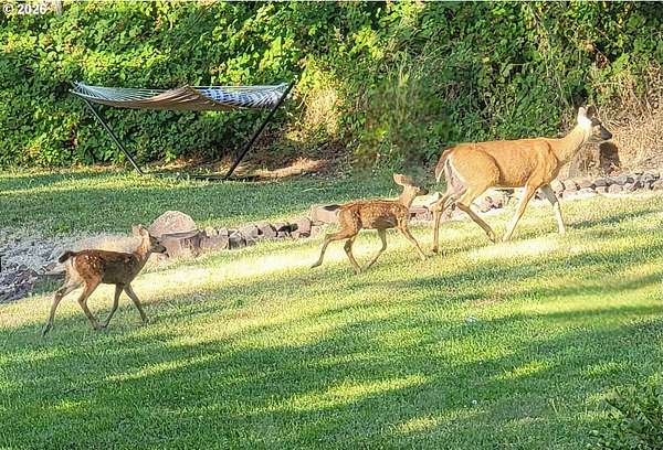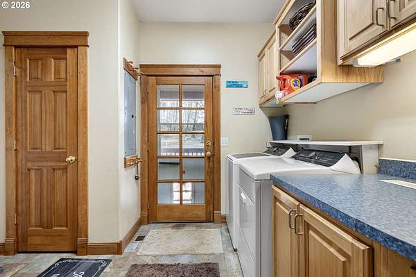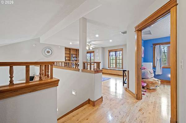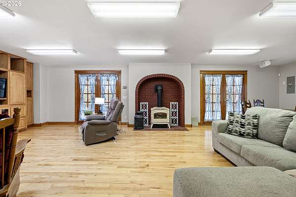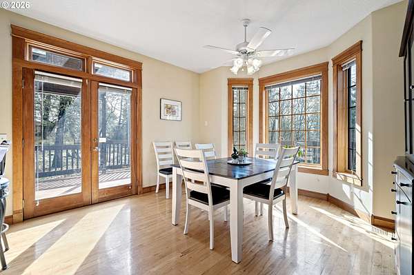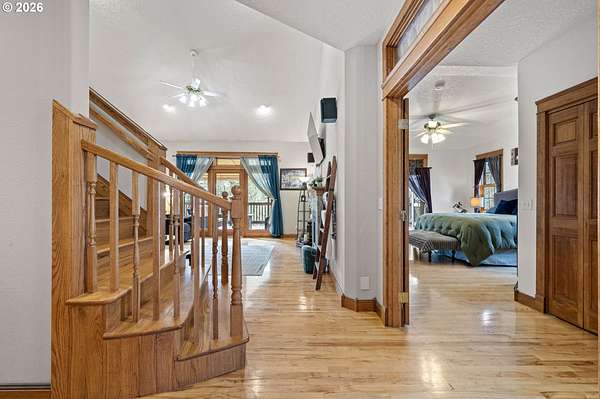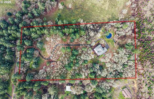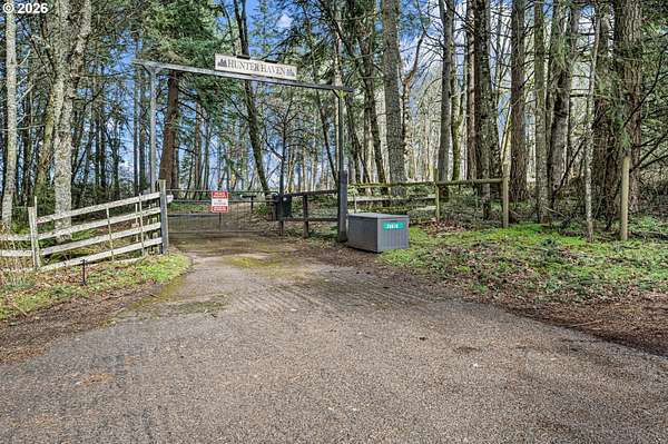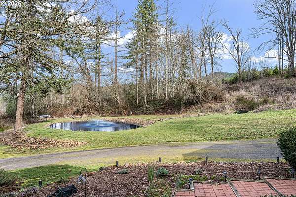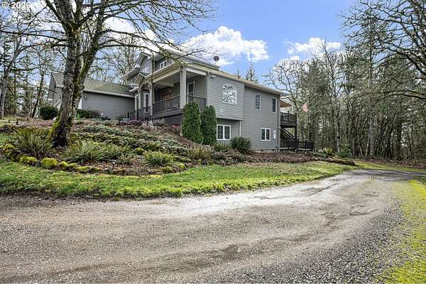 Exquisite custom-built home nestled on a private wooded 6.65 acres. Enjoy the tranquil views from your covered front porch, overlooking the waterfall & pond while enjoying some frequent visiting turkey or deer. This home & property boasts an abundance of opportunities and is currently set up for separate living. The main level is adorned with beautiful hardwood floors & solid oak accents. From the entry you are greeted with French doors leading to an office/den or Formal Dining. The living room has soaring vaulted ceilings, double side fireplace & French doors to the wraparound composite deck that features 2 retractable awnings & overlooks the backyard. Kitchen opens to dining area, and features eating bar, stainless steel dishwasher & refrigerator (included) an abundance of storage w/appliance garage, pull-out shelving and some butcher block counter tops. The dining area has additional French doors to covered deck w/skylights. The spacious primary suite is kept cozy with double sided fireplace, French Doors to deck, walk in closet, spacious bath, with two vanities, jetted tub & walk in shower. Upstairs loft overlooks living room w/ built-ins, plus two bedrooms & bath. Lower level has 2 more bedrooms, full bath, kitchen, large family/dining room w/propane stove & French Doors. This space can be part of the main home or separate w/exterior entrance & own carport. Additionally, home has central vac, utility rm w/sink & built in ironing board, plus 3 yr old HVAC's 3 1/2 ton & a 2 1/2 ton systems, 2 newer water heaters. Huge pantry/cold room or storage. Property is gated w/large shop/studio w/2 attached storage spaces & 3rd separate storage/potting shed or child's playhouse, 2 separate fenced garden spaces. Property previously had a manufactured home towards front of property w/2nd septic, electricity, etc., & firepit great for RVing guests. Buyer to do own due diligence re: adding a 2nd dwelling or hardship. Call your favorite agent today to schedule a viewing!