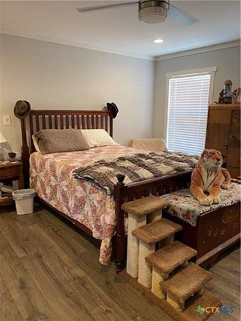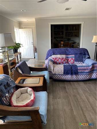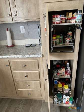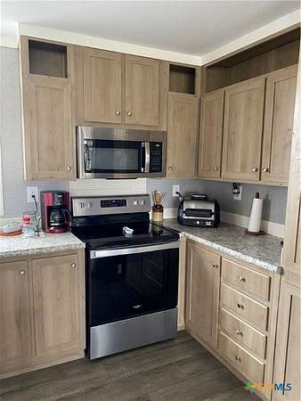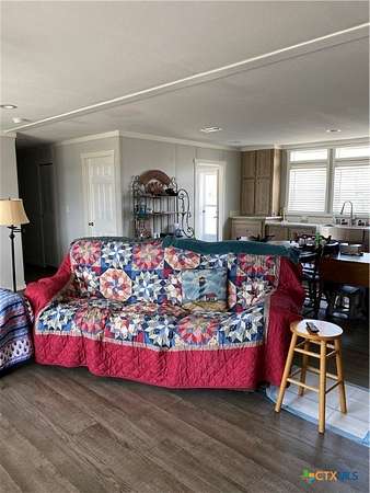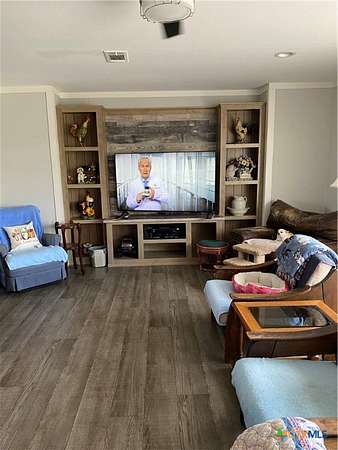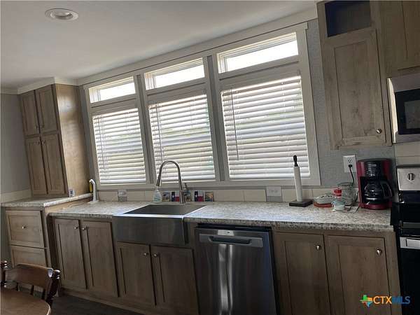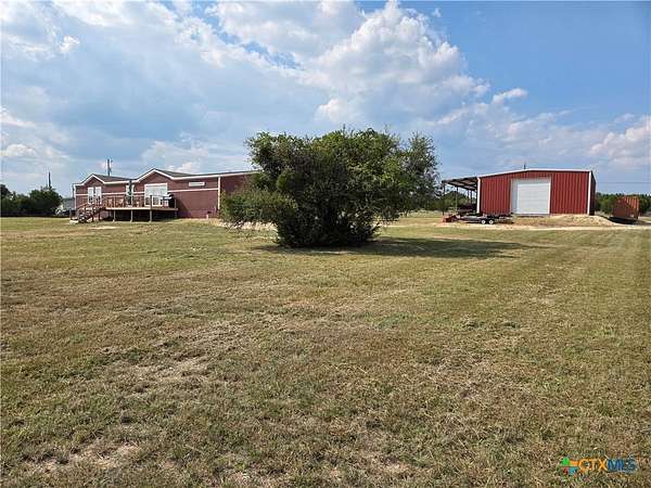 This 4 bedroom, 2 bath manufactured home was built in 2022 and has two decks to enjoy your property! It sits on a concrete slab, has 24-inch footers and is anchored into the concrete. The first deck takes you into the mud/utility/laundry room. From there you go into the kitchen area. Here you will find long counters, a stainless steel farmers sink, kitchen faucet with a built in light, the cabinets around the refrigerator have pull out drawers, and your eat in area. There are no rugs in the home, you either have vinyl plank or upgraded Pergo flooring. The kitchen is open to the living room with a built in entertainment area and the formal dining. All rooms feature recessed lighting. From the living room you can go out onto the second deck for grilling and enjoying the acres out back. The primary bedroom and bath are on one side of the home, and the remaining 3 bedrooms, hall bath and walk in pantry are on the other side. There is also a large metal building boasting 2400 SF sitting on 8 inch concrete flooring with a loft along one side, bathroom, office, completely insulated, 14 x 14 ft. doors to accommodate even large vehicles. It has 220V electric service which can support heavy machinery and power tools. The overhang on the right side comes complete with RV hookups including electric, water and septic. This property has two septic systems, so a second home could be serviced. The 5-acre lot provides plenty of outdoor space for the possible horse enthusiast , gardner or other hobbies. Refrigerator, stove and dishwasher currently in kitchen are excluded and will be replaced with the OEM ones that came with the home. The refrigerator is currently in the utility room.