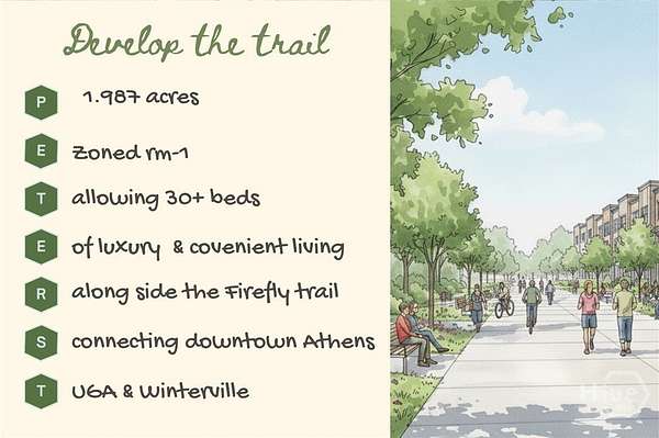 Unparalleled development opportunity in the heart of Athens, this 1.987-acre parcel features 480+ feet of frontage along the Firefly Trail. Zoned RM-1 (16 beds/acre), this site is the ideal canvas for luxury townhomes or condos. Located across the street from the Peter Street entrance and iconic reconstructed trestle bridge, the property offers ultimate walkability. It is situated just steps away from the North Oconee River, Greenway Trail, Dudley Park, Downtown, and Trail Creek Park. Future residents connect directly to UGA and Sandy Creek Nature Center via the trail network. Situated next to Mama's Boy restaurant and near Cafe Racer, this is a rare chance for a developer to place their mark on the future of the Firefly Trail.