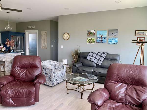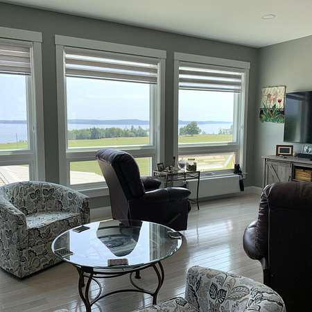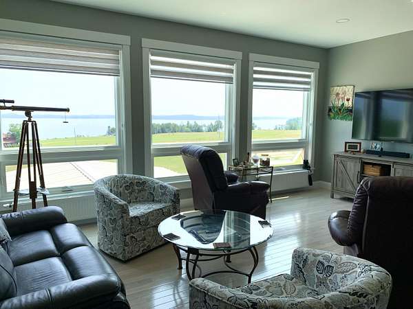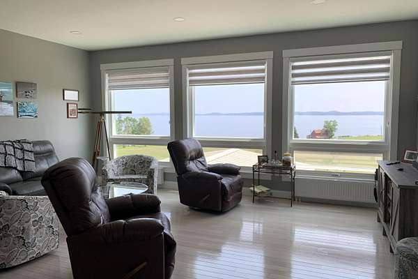 Finished in 2024, this new build has all one dreams about. Waterfront with easy access to the beach, 3 acres of land, unobstructed views of Passamaquoddy Bay, fabulous sunrises to name a few of the many features. One floor living with open concept kitchen and living room and wide open views! Pull up a seat and have a glass of wine with the chef. Farmers sink and well thought out design complete with large pantry room off the kitchen, perfect for your special projects. With the living room wall of glass, you never tire of what lies beyond. The master bedroom with ensuite bath features a jacuzzi tab, separate tiled shower, laundry and a walk in closet. Also, there is another full bath for guests closer to the garage entry. For holidays and special occasions, there is plenty of space in the dining room. Think of the basement as a family suite unit - finished beautifully allowing guests a perfect set up for weekly rentals. Or perhaps you will want to rent to a visiting health professional working in the area. And finally, a well thought out 2 car garage to park your wagon! Will be sold primarily furnished with Apartment being turnkey. Shown only by appt.