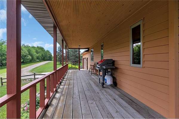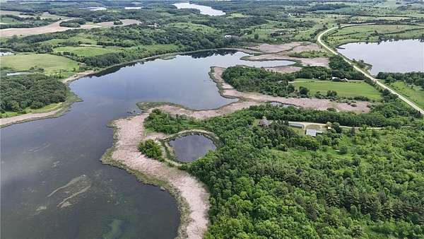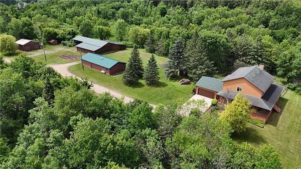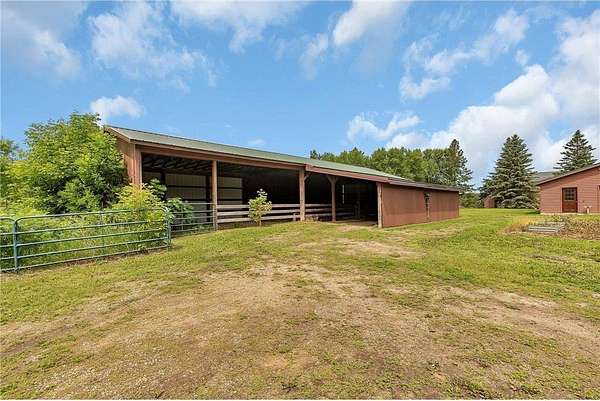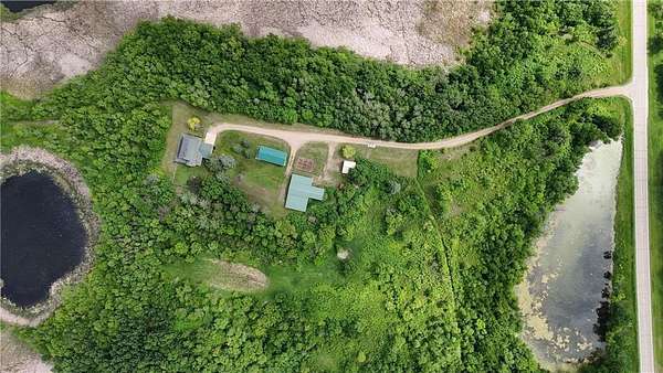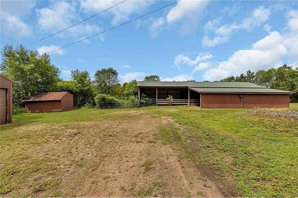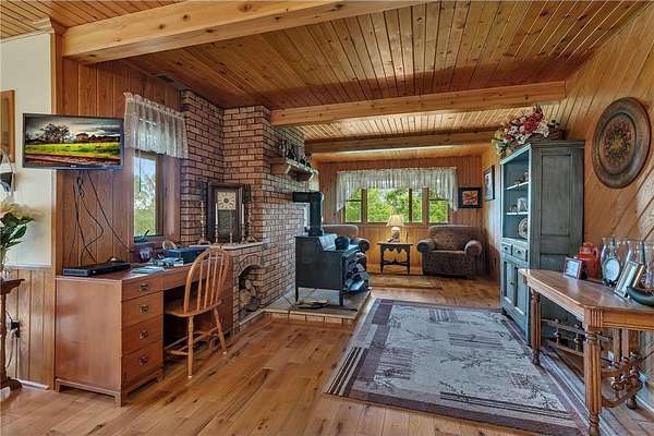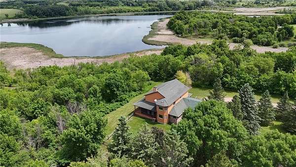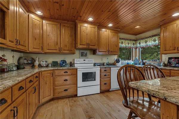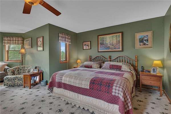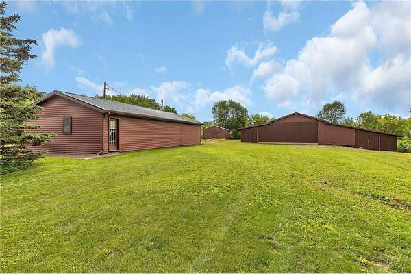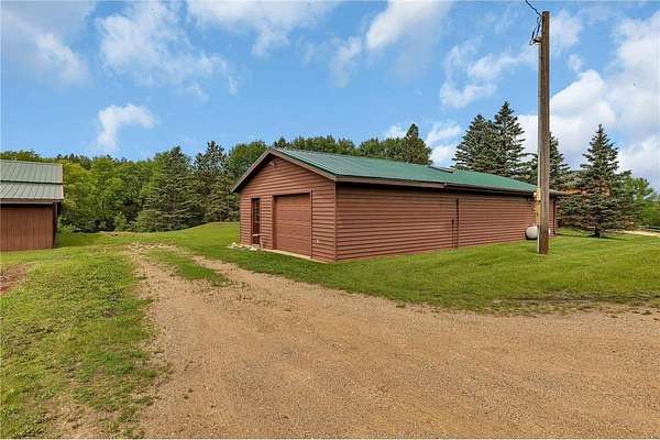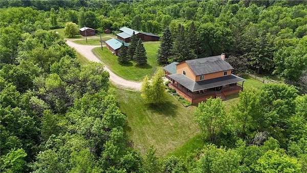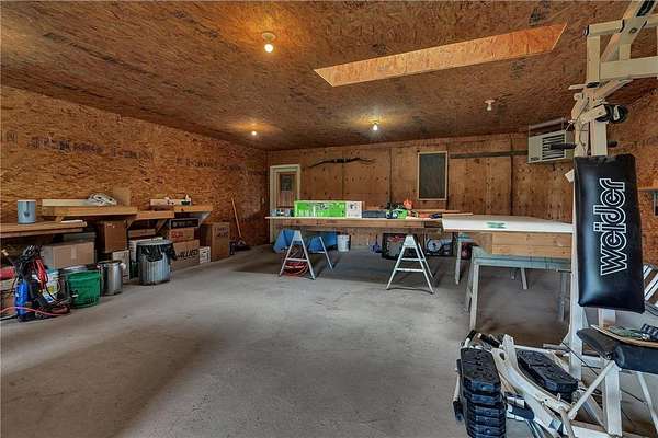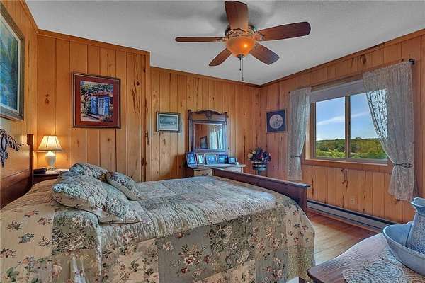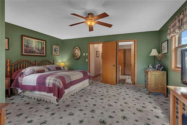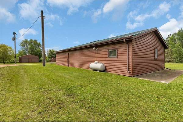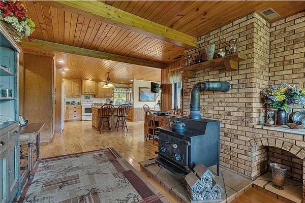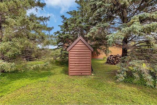 The home's open concept kitchen is equipped with elegant granite countertops and a convenient center island, making it both stylish and practical. A wood stove adds warmth and charm, creating a cozy ambiance on cold winter nights. The primary bedroom is impressively spacious, and each of the four same-level bedrooms includes a large walk-in closet for ample storage. This property features a two-stall attached garage and a two-stall detached garage, providing plenty of space for vehicles and outdoor equipment. Additional amenities include a 48x22 heated shop with a concrete floor, a storage shed, a barn with multiple storage areas, and an outdoor wood boiler to ensure comfort throughout the year. Jolly Ann Lake is renowned for excellent boating and fishing, with a maximum depth of 89 feet. Recent upgrades include a new mound system installed in 2024 and new metal roofs on both the shop and detached garage in 2023. For those who require connectivity, fiber optic internet is available. This peaceful and meticulously maintained lakefront home, complete with acreage and outbuildings, is truly a rare find. Opportunities like this do not come often. Schedule your showing today to experience the unparalleled beauty and tranquility of Jolly Ann Lake living!