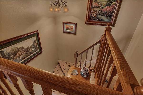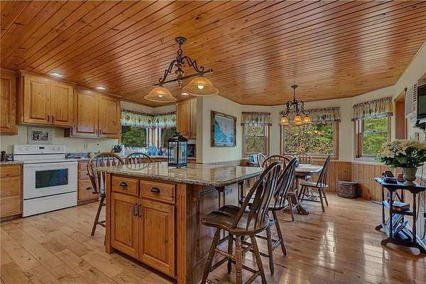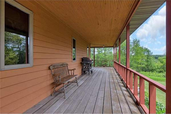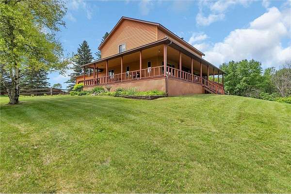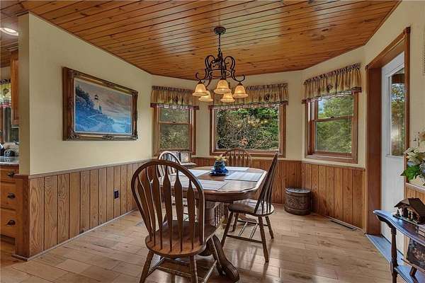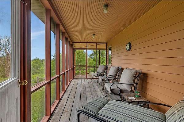 Enjoy breathtaking views of both water and woods from the sprawling wraparound porch, which provides the ideal space for relaxation and entertaining guests in a serene environment.