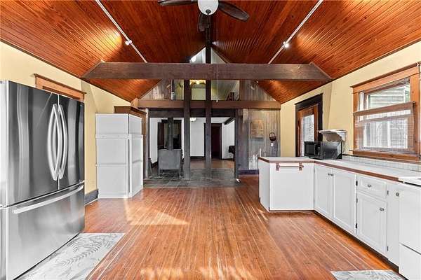 The home itself is a 3-bedroom, 1-bath farmhouse with timeless character. It includes a wraparound front porch, back deck, and a large, spacious kitchen that was added in the 1990s. Upstairs you'll find a bonus loft space perfect for an office, guest area, or creative retreat.