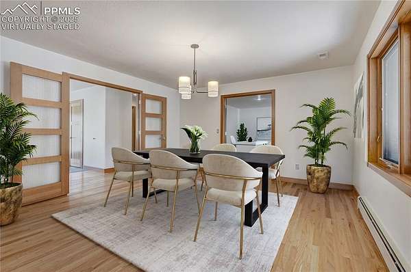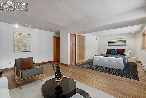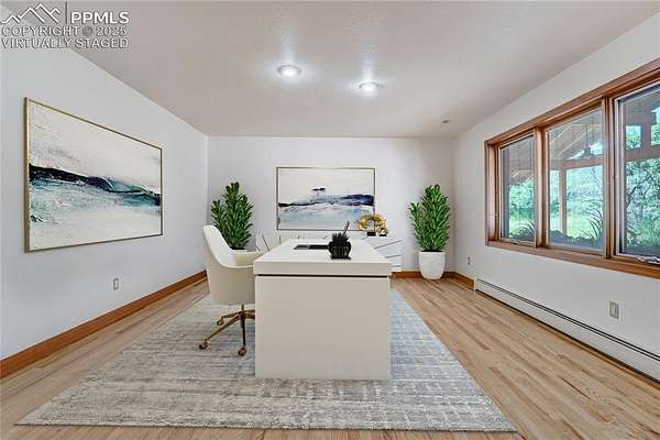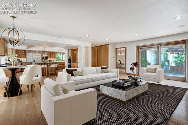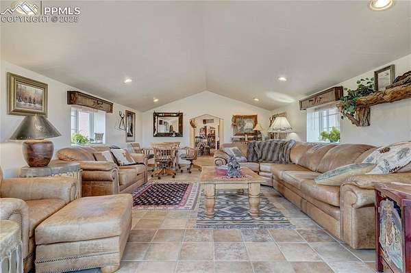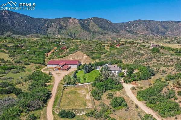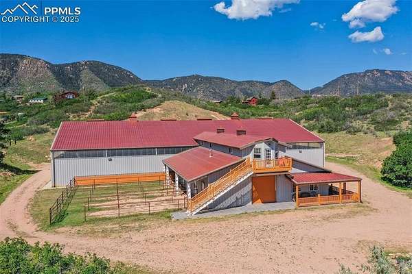 Luxury equestrian modern home on 13+ acres w/indoor riding arena, & barn w/studio. As you enter natural slate & solid hardwd flrs lead you to the great rm. Large bay window captures views of the valley. The light & bright great rm features a wd burning FP w/flr to ceiling slate & granite surround, built-ins & entertainment cabinet. The views & natural light continue in the chefs dream kitchen. Designer glass countertop island w/breakfast bar, craftsman-built cabinets, subway tile, commercial SS appliances, LED lighting, dumb waiter, pantry w/ pull out drawers & more! Walk out to the backyard oasis w/expansive multi-tier flagstone patio incl a covered/heated area w/built-in kitchen grill/smoker, 2 beverage taps, bar, & stream/waterfall features on either side. Lighted/fenced sports court perfect for pickle ball in the beautiful private setting. Back inside the formal dining rm features chandelier & wd flrs. The main lvl primary suite is loaded w/amenities; walk-out access, panoramic views, FP, sitting area, lux 5pc bath w/standalone jetted tub w/great mtn views, spa shower w/steam, radiant heat flr, separate glass vanities w/ floor to ceiling glass tile walls, custom luxury closet, & adj laundry rm w/cabinets & 2 sinks. 2nd main level bedrm has built in shelving & in-wall bed, offering a flexible guest rm w/nearby full bath. The walk-out bsmnt offers a large wd bar w/plenty of seating, space for pool table & sitting area w/wd burning stove. Lower-lvl office captures mtn views & has wall of built-in shelving & desk. 1 of the 2 bsmnt bedrms has sitting area while the other bedrm is setup as a workout rm. Both have easy access to hall bath w/steam shower. Quick walk to the heated/irrigated 140x80 riding arena, 60x40 shop w/concrete floor, 5 stall barn w/tongue & groove walls/ceiling, multiple large entries/exits, tack rm, handicap accessible bath, spacious 1bd 1ba barndominium w/full kitchen above, & more. Must see CO luxury ranch w/great access.