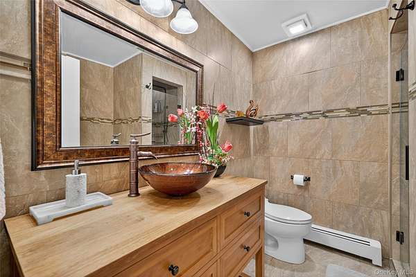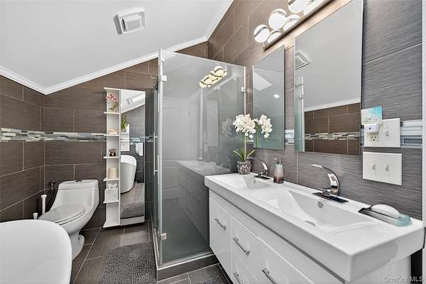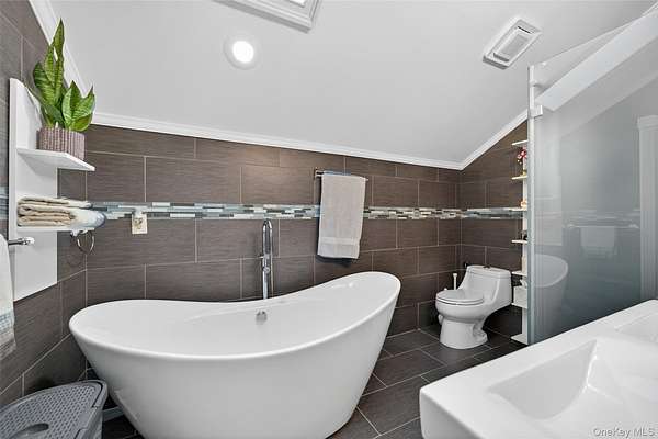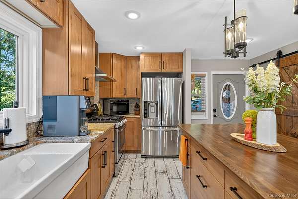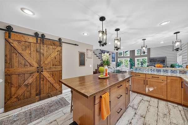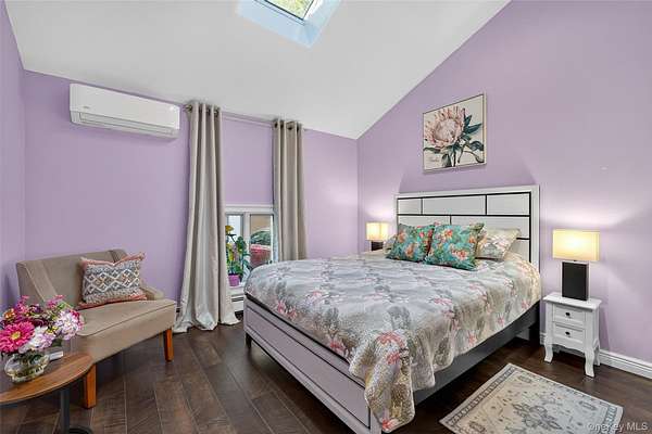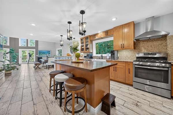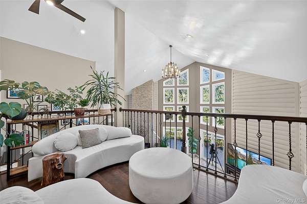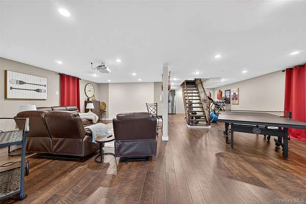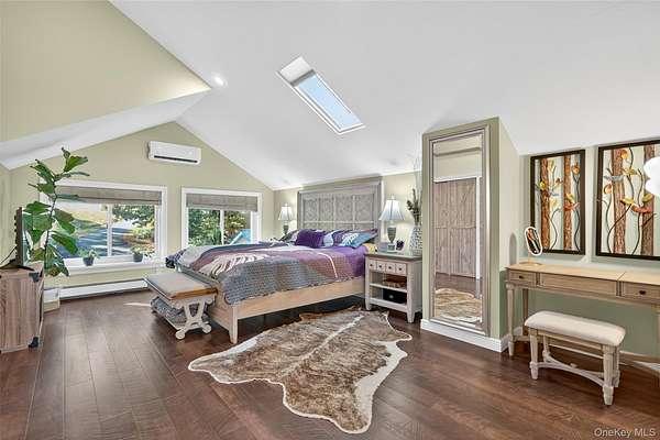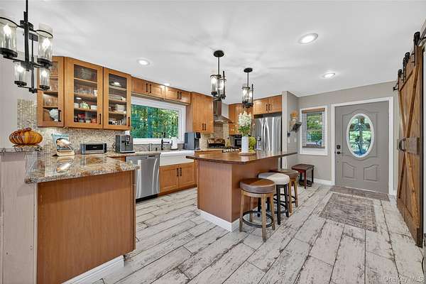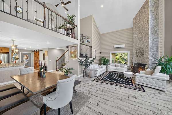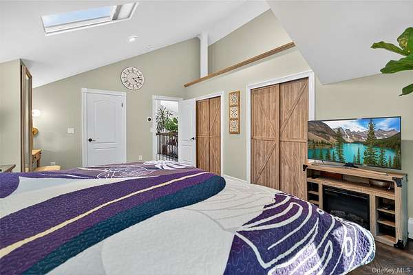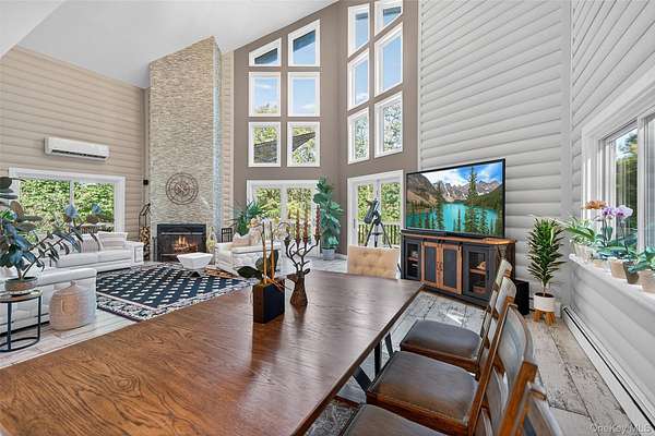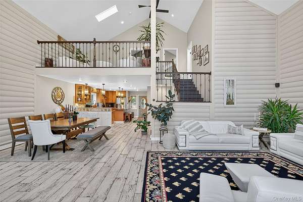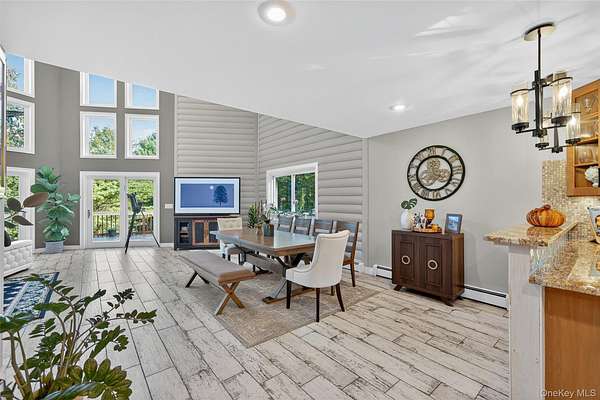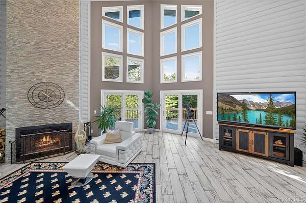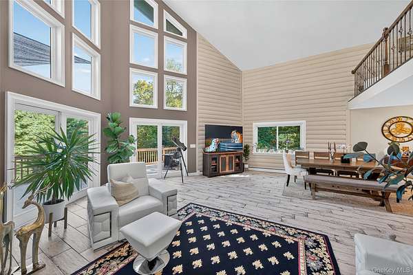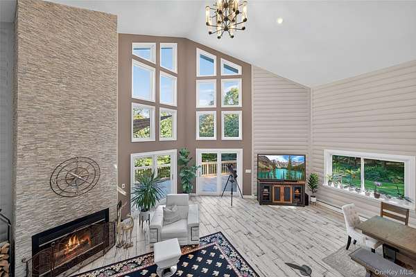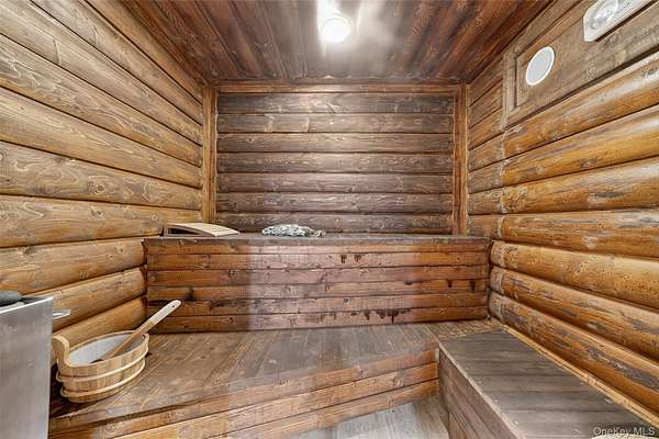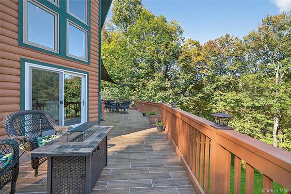 Exquisite 2-story contemporary log-sided home set on 1.69 acres with deeded lake rights to Bishop's Pond with private dock access to the water for fishing, boating, and other recreational uses. Offering 4 bedrooms, 3 full baths, office space and 3,244 sq ft of living space, this home blends rustic character with modern convenience. The great room features soaring cathedral ceilings, walls of glass, granite-accented kitchen with island, and a dramatic stone fireplace all with radiant heat with sliders to an expansive entertaining deck. Finished walk-out lower level includes game/family/gym room, sauna, steam shower, laundry and storage. Outdoor living shines with expansive 2-level decks overlooking the water and landscaped ground. Recent upgrades: new boiler, water softener, windows, water tank, HVAC system, and general renovations (2023-2025). Additional features include Nest multi-zone thermostats, EV car charger, intercom, 1-car attached garage, and sheds. Asphalt driveway and paver walkways (2020). Ideally located minutes to Bethel Woods Center for the Arts, restaurants, motorboat lakes, racetrack, hiking, and more-an ideal year-round or investment property. Just 2 hrs to NYC!