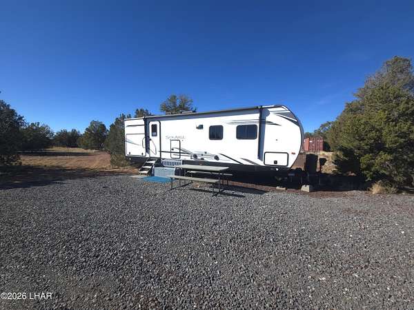 Est $1,444/moOpen air and Blue skies on this beautiful mountain retreat! Fully fenced and locked gates are just a couple of the improvements on this property! MORE than ample water storage and ready for solar! Lots of mature Juniper and pinion pines for lots of shade. Cindered driveway in with a huge area cleared for building your dream getaway or hunker down in the 2023 - 1 bd 1 bath RV included. You also could make the 40 ft connex into a tiny home. So many possibilities!