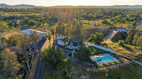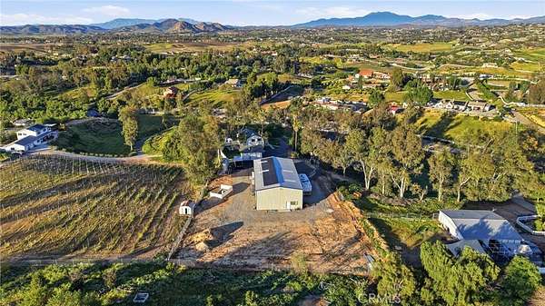 Welcome to 35835 Meadow Ridge, a truly unique property situated on 2.73 acres in the heart of Temecula Wine Country. This privately gated and fully fenced estate offers privacy and space. It is located directly behind South Coast Winery and just minutes from wineries, restaurants, golf courses, Old Town Temecula, and Pechanga Casino. The recently renovated home features 3 bedrooms and 2 bathrooms upstairs. All bedrooms enjoy scenic views, and a large, expansive deck creates the perfect space to relax or entertain. The property also includes an impressive 3,200 sq ft steel building measuring 40x80 feet, with 23-foot ceilings, a 23x23 loft ideal for storage, and a half bathroom. The building is fully insulated and equipped with a 5-ton air conditioning system and an electric heating element. It has a 400-amp electrical panel powered by over 15 kilowatts of solar panels owned in full. Within the building is a 1,000 sq ft ADU featuring a kitchen, open living space, 1 bedroom, and 1 bathroom with dual vanity, shower, and soaking tub. The ADU has its own separate 2-ton high-efficiency air conditioner. The outdoor space is equally impressive, with a brand-new pool built in 2022, fully fenced, and equipped with both electric and propane heating. The usable acreage offers ample space for a vineyard or other uses. The paved road provides easy access to town. Additional highlights include no HOA, low taxes, and location within the highly desirable Temecula School District. Don't miss this rare opportunity to own a versatile wine-country property that combines privacy, functionality, and a lifestyle.