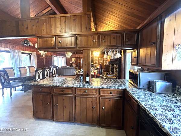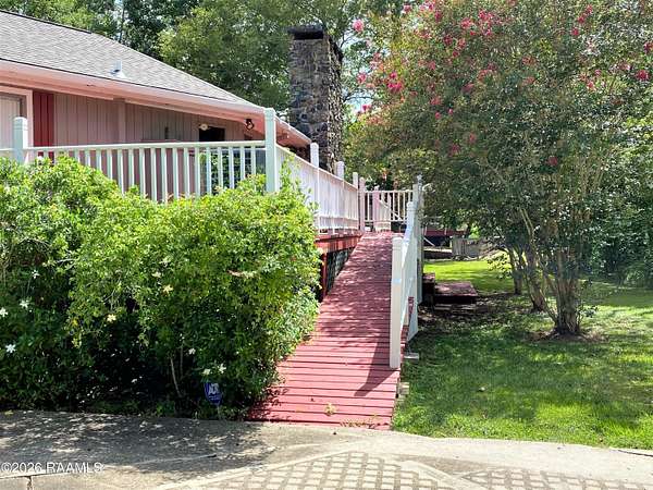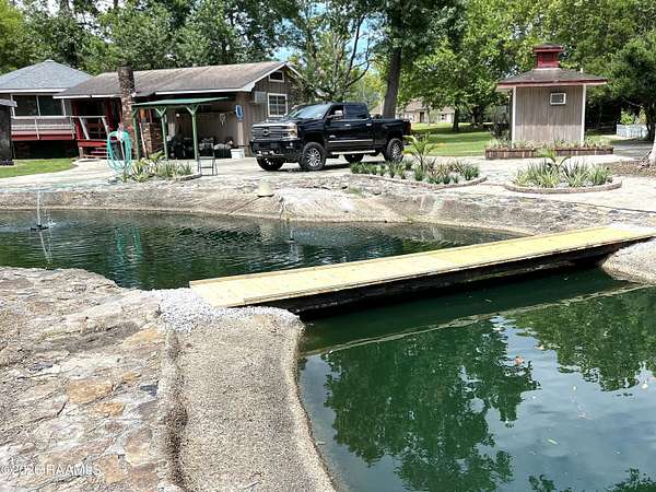 Set on 2 peaceful acres just off I-49 service rd near Sunset, this exceptional property offers a rare blend of space, privacy, and amenities--perfectly balancing quiet country living with quick access to surrounding communities. The main home welcomes you through large solid wood double doors that create a sense of warmth and grandness. Inside, natural wood cathedral ceilings, striking stone fireplace, and open kitchen/living concept create an airy, inviting atmosphere. Sliding glass doors in the living area and bedrooms bathe the home w/ natural light and provide seamless access to the expansive porches, including a handicap-accessible ramp. The open/split floor plan offers a primary suite w/ ensuite bath on one side while 2 additional bedrooms and bath are on the opposite side. Outdoor living and entertaining truly shine here! A thoughtfully designed pavilion connects a covered picnic area with built-in seating and BBQ pit to an enclosed outdoor kitchen with updated countertops; stove, refrigerator, and microwave are included. Adjacent is an enclosed octagon building, currently used as a home gym, featuring a shower and a unique hidden in-floor small pool beneath the center floor (currently not in use). A charming outbuilding provides a convenient half bath for guests. The property is well equipped for a self-sufficient lifestyle; 4 raised garden beds, chicken coop w/ attached storage shed, and beautifully restored pond stocked w/ Black Brim and frequently visited by wood ducks. More features: NEW 20x40 metal shed w/ roll-up door, professional landscaping, new fencing, new sewer treatment system. Roof, plumbing, and 2 HVAC units updated approx 5 years ago. Water supplied by submersible well tapping natural underground springs; city water also available. Ample open yard space to roam, relax, or expand your vision, this property offers a lifestyle that is increasingly hard to find--peaceful, private, and richly functional. Schedule your private tour today!