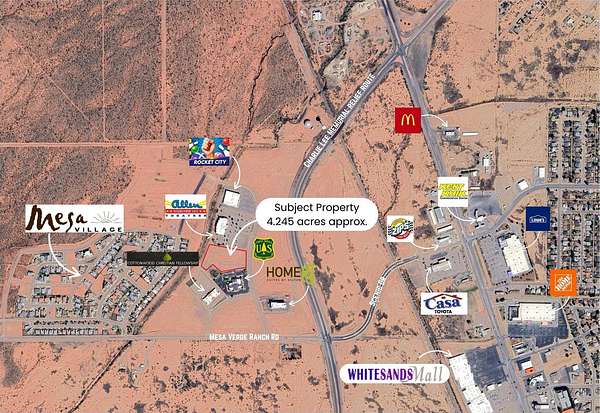Positioned at 3591 Mesa Village Dr, this 4.245-acre parcel offers a prime opportunity within Alamogordo's thriving Mesa Village Development. Boasting significant frontage along Mesa Village Dr., the property ensures excellent visibility and accessibility. KEY FEATURES: SIZE: Approximately 4.245 acres. LOCATION: Frontage on Mesa Village Dr. SURROUNDING BUSINESSES: Allen Theaters, Rocket City Family Fun Center, US Forest Service, Home2 Suites Hotel, Cottonwood Christian Fellowship Church. FUTURE DEVELOPMENTS: Proximity to the planned Otero County Courthouse. UTILITIES: Available nearby. ZONING: Commercial, Business C-3 District. This property is ideal for retail, office, hospitality or mixed-use development, benefiting from the area's steady growth and the influx of both local and visitor traffic. The surrounding amenities and upcoming developments enhance its appeal, making it a strategic investment opportunity.