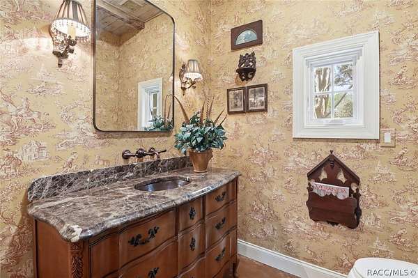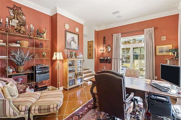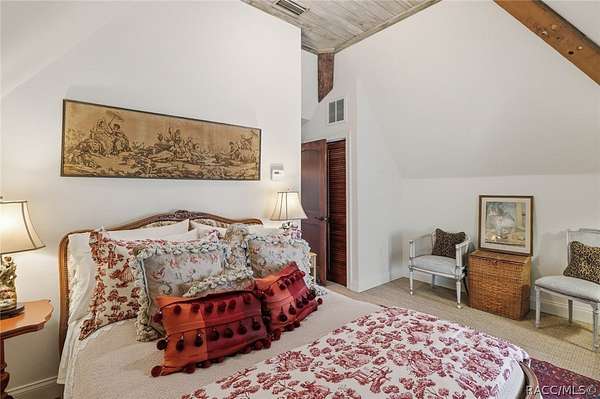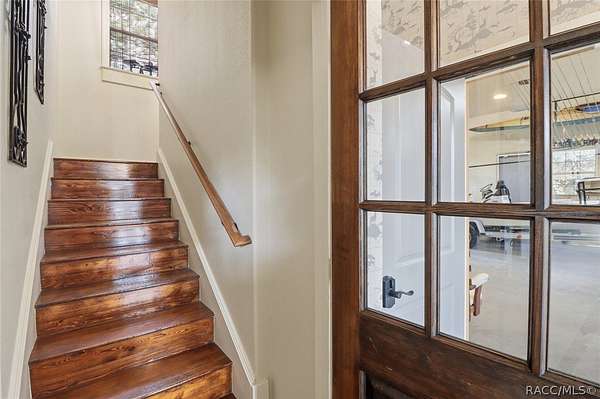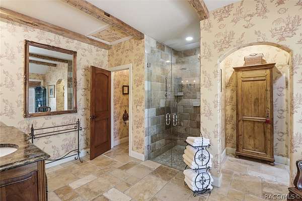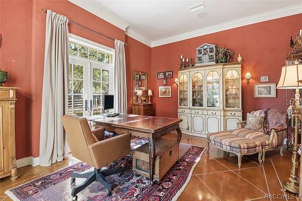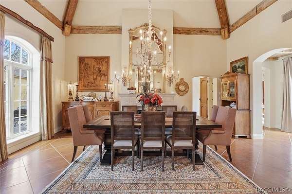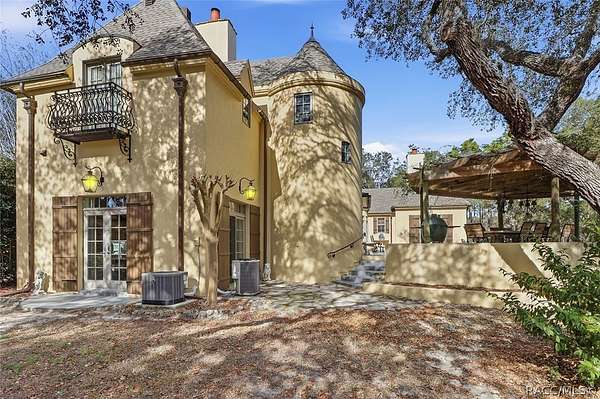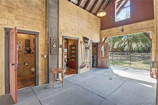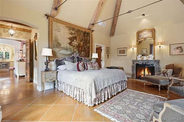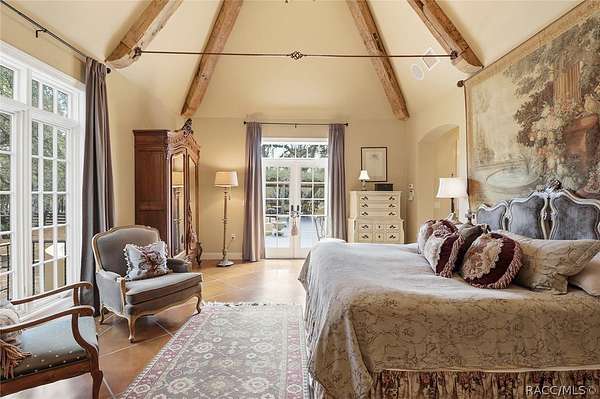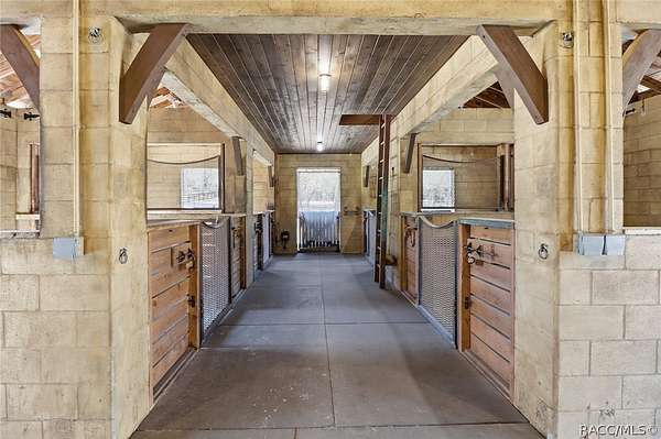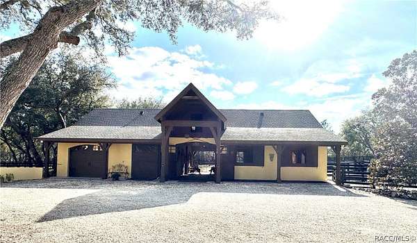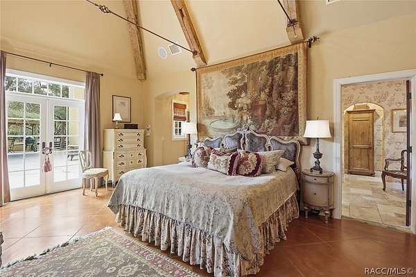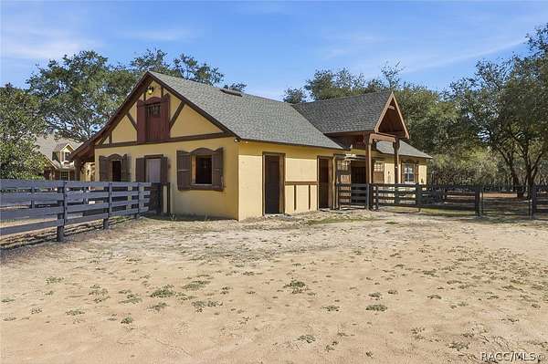 RARE OFFERING! Step into a storybook French Country Mansion set on 6 private acres directly along one of the 28 miles of equestrian trails in sought after Pine Ridge Estates. This enchanting estate features timeless character, featuring imported wood ceiling beams and antique doors sourced from historic churches, creating a warm, soulful atmosphere rarely found in modern construction.The residence offers a magical craftmanship and gracious scale, ideal for those seeking authenticity, privacy and equestrian lifestyle living. Complementing the main home is a four stall horse stable with bathroom, air conditioned feed room and work area. A separate boat and RV building provides exceptional storage for recreational vehicles and equipment. On the second story of the building one finds a full apartment with bath and kitchen, ideal for guests, staff or extended stays. This is a rare opportunity to acquire a refined estate offering acreage, trail access and premier auxiliary structures in Pine Ridge's most sought after setting.