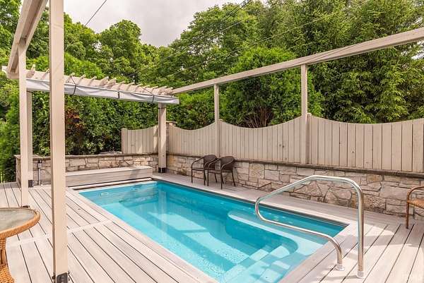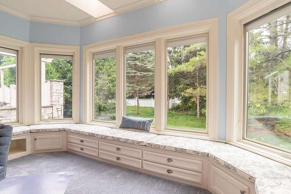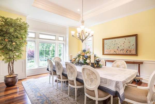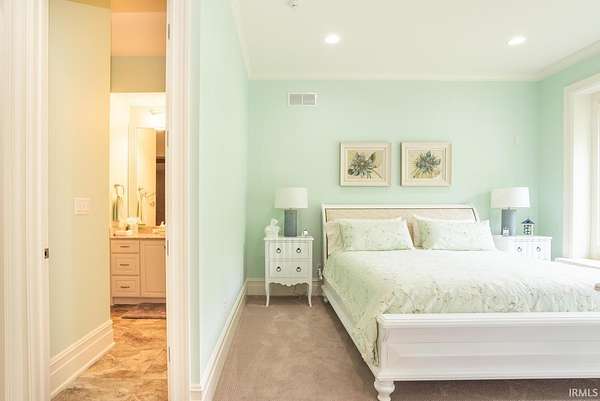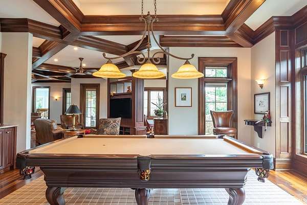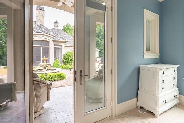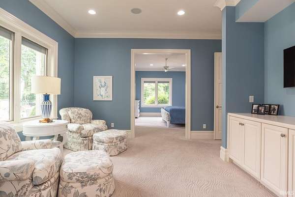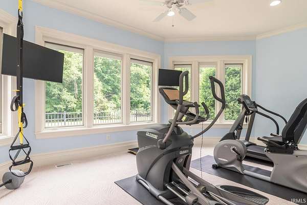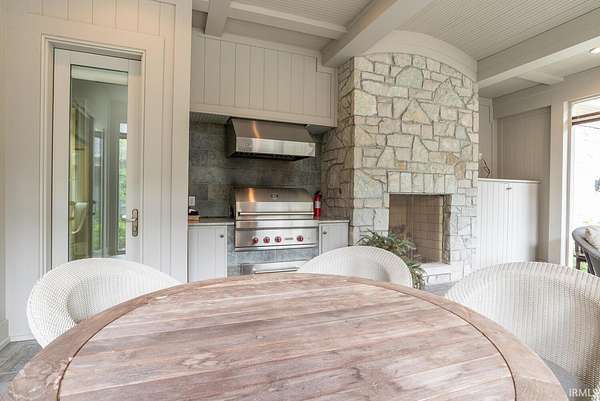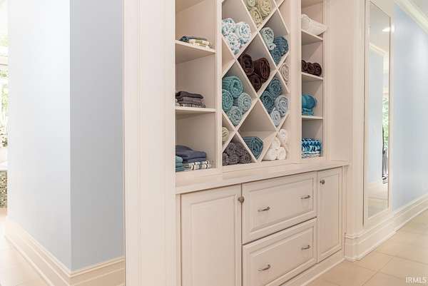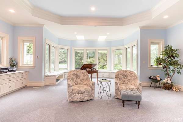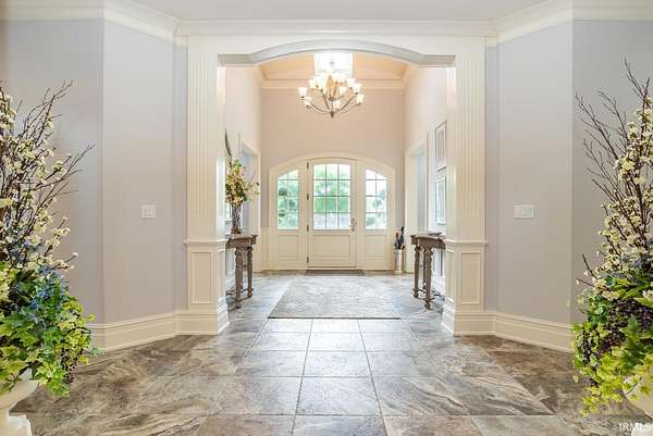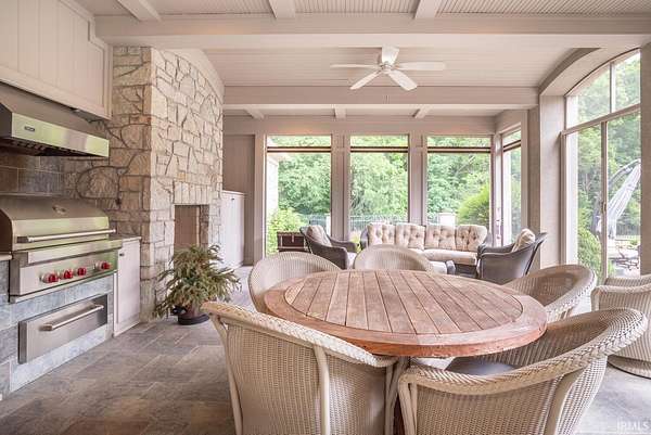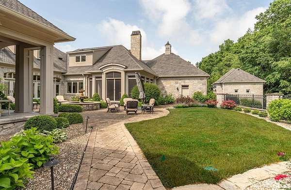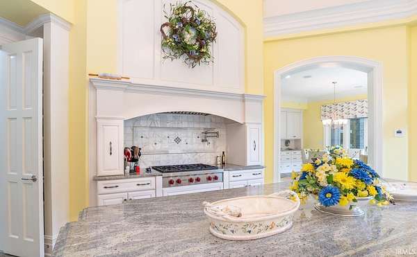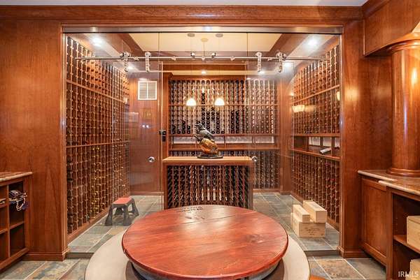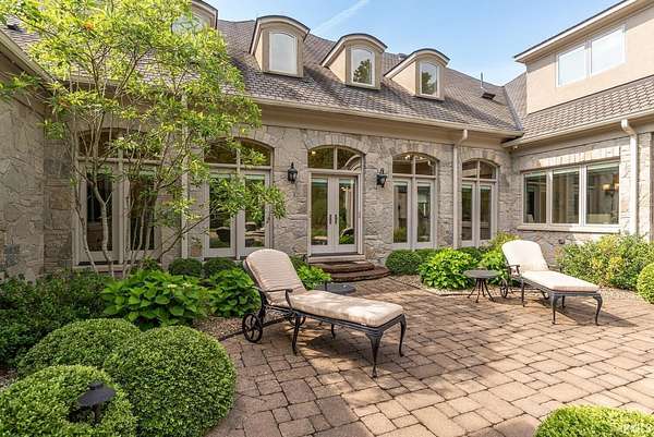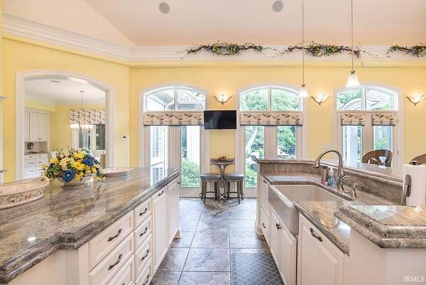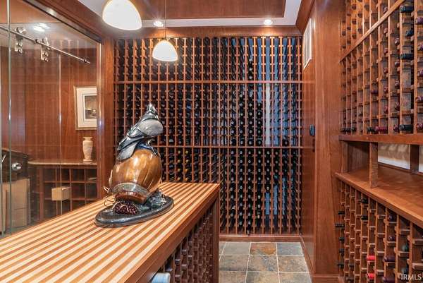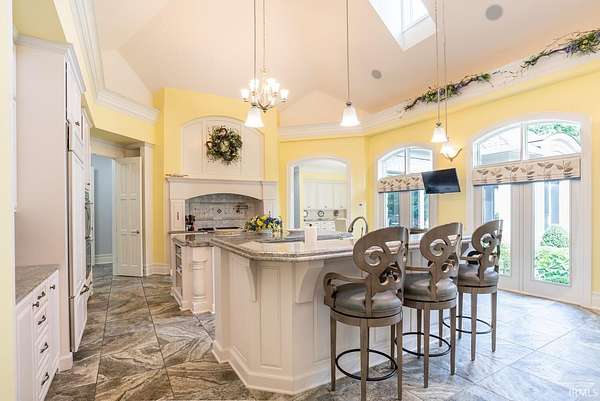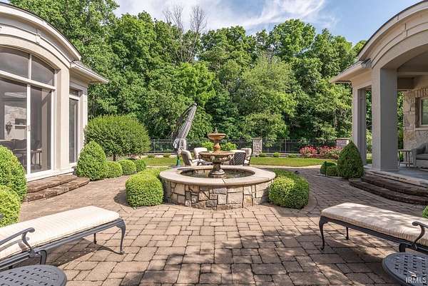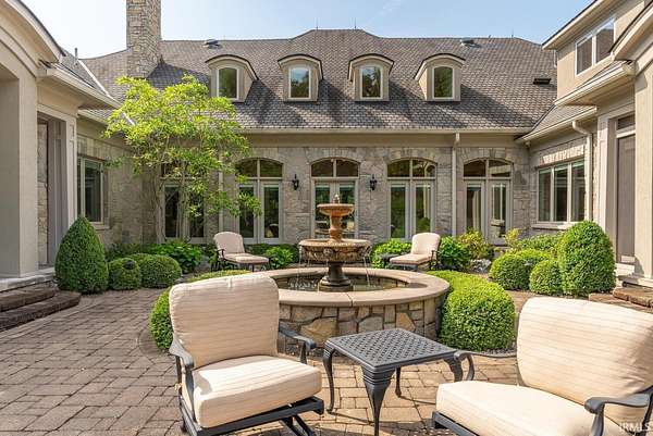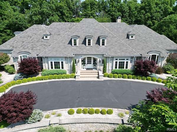 Stunning limestone artistry surrounds you in this custom home on over four acres in this estate home in Stoneridge. The beautiful stone work and craftsmanship honors the local industry in this custom design with privacy. Solid wooden doors, high caliber finishes, hardwoods, stone fireplaces, a custom kitchen and gathering area are all highlights of this home with a library and wood paneled study that includes media area and recreation features. The circular plan flows to two main level studies and views of professional landscaping and privacy. The primary suite wing on the eastern side of the home features access to the courtyard and true spa features with soaking tub, ceramic shower with jetted features and a swim spa access. The suite features a dedicated gym and study area, primary laundry, storage built-ins and two dedicated dressing rooms with custom furniture quality built-in cabinetry. The kitchen is the heart of the home and features double islands with professional Wolf cooktop and double ovens, custom walk-in pantry, plus great access to the formal dining room with Butler's pantry and wet bar. The breakfast room has courtyard access plus flows into the screened family room with beautiful stone fireplace and courtyard views. The West wing of the home has two additional bedroom suites on the main and a dedicated laundry area with fantastic storage. There are two powder rooms on the main level for guests and for owner convenience. There is an upper level bonus room that serves as a dedicated suite with a kitchen that is perfect for long-term guests. There is an attached three car garage and also an additional two car detached garage. There is beautiful natural light throughout this home and superb site lines from every angle. For convenience, this home has an elevator that accesses the upper level bonus room and also to the lower level living space. The lower level has a wonderful study guest area and access to the beautiful wine tasting room with custom wooden paneling. There is wonderful finished and unfinished storage in the lower level that's perfect for off-season items. Beautiful mature trees and a lovely drive over your bridge creates a relaxing atmosphere that allows your day to melt away as soon as you pull into the home. This pristine home has had wonderful care and is built like an institutional structure for years of enjoyment. Stoneridge is one of Bloomington's most beautiful communities.