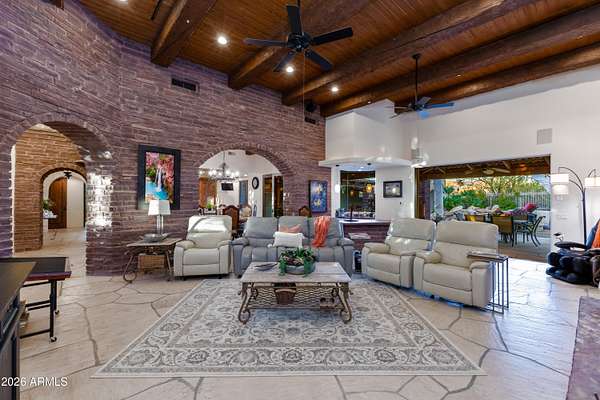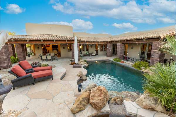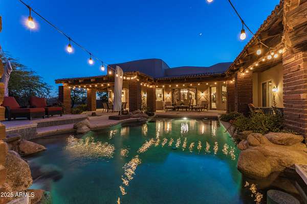 Welcome to 35931 N 82nd Place in the exclusive Tecolote community of Scottsdale, AZ - a stunning desert retreat where timeless charm meets effortless comfort. Set on over 1.5 acres of peaceful Sonoran beauty, this custom-built home blends authentic brickwork, rich wood beams, and graceful architectural arches to create a feeling of warmth the moment you arrive. Every space tells a story - from the inviting great room that opens to the covered patio, to the resort-style backyard that glows under string lights and sunset skies. Entertaining is effortless here, with multiple gathering spaces and a private guest casita complete with its own kitchen. Outside, the sparkling pool and spa invite you to slow down and savor the quiet luxury of desert living. Enjoy privacy, space, and connection all just minutes from Scottsdale's best golf, hiking trails, and boutique shopping. This Tecolote treasure captures what desert living is meant to be: relaxed, refined, and undeniably inviting.