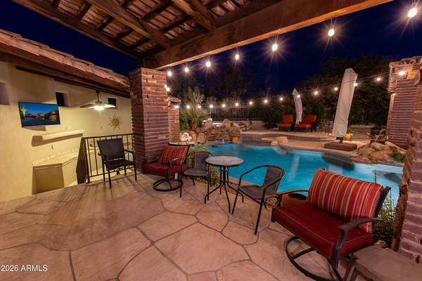 There's a reason certain homes sell themselves. This 1.5-acre Tecolote estate is one of them. This isn't just another North Scottsdale property; it's pure Sonoran soul where architectural integrity meets effortless luxury. Step through handcrafted brick archways into a world of soaring wood-beamed ceilings and natural flagstone floors that guide you from the expansive great room through the gourmet kitchen and straight out to covered patios where the real Arizona magic happens. The kitchen was designed by someone who knows their way around serious cooking. A professional Wolf range commands the space. Dual granite islands offer generous prep and gathering zones. Custom wood cabinetry manages to be both gorgeous and highly functional. Outside is where the property truly shines... Your evenings? Poolside under a dramatically lit timber-frame ramada, spa bubbling, string lights dancing overhead. The attached casita--complete with its own full kitchen--turns hosting into an art form, whether it's extended family, discerning guests, or your own private retreat. And there's more: with 1.5 acres and smart site lines, there's ample room to add an additional garage or a new casita, subject to buyer verification of permits and zoning. Keep the current flow or expand to match your vision. Every surface tells a story: exposed brick fireplaces, hand-hewn vigas, tile work that whispers of Old World craftsmanship. Yet nothing feels precious or untouchable. This is a home meant to be lived in, celebrated in, exhaled in. Minutes to championship golf, world-class hiking, and Scottsdale's finest. But once you're here, behind your gated courtyard fountain, you might just forget to leave. Make sure this one is on your list--some homes you have to see in person.