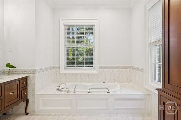 - Attic, Ceiling Fan(s), Double Vanity, Entrance Foyer, Fireplace, High Ceilings, Jetted Tub, Kitchen Island, Main Level Primary, Pantry, Primary Suite, Pull Down Attic Stairs, Recessed Lighting, Separate Shower, Split Bedrooms