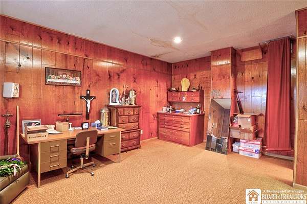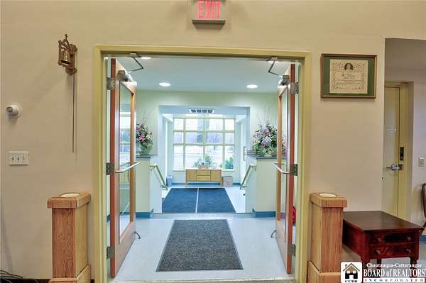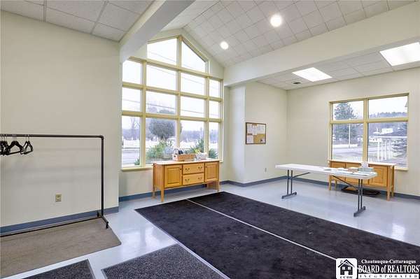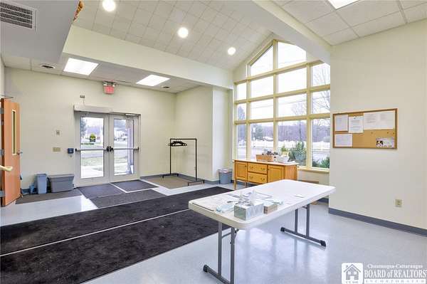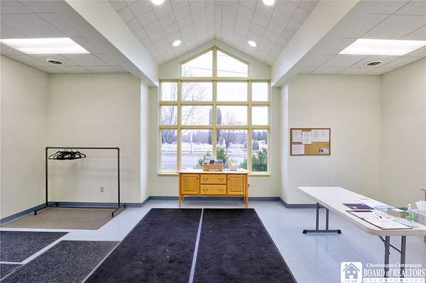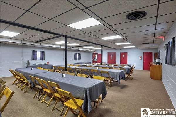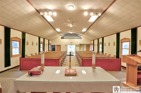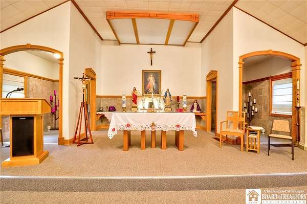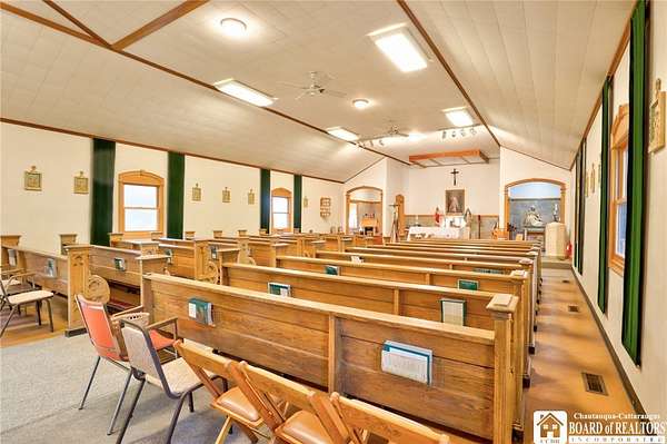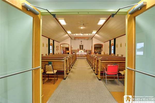 Beautifully maintained church in the heart of Panama is now available! This property is a one story, vinyl sided with finished lower level for a total of 5,360 square foot building. It was built in 1956 and added an addition in 2008. with parking for approximately 5 cars on the blacktop area near the building; gravel area behind provides another 25-30 cars. There is also a 12' x 12' shed on the property. Building type is religious; back parcel agricultural. The main level of the building consists of narthex, sanctuary with lovely pews for approximately 100 people, sacristy, choir loft, two half baths and back entry. The lower level has a spacious rec hall, full kitchen, two more rooms, utility room, two half baths and side exit. There is an elevator to reach the lower level. The building has been very well maintained and is in excellent condition, both inside and out. Please make sure to review the Restrictive Covenants in the attachments prior to showing