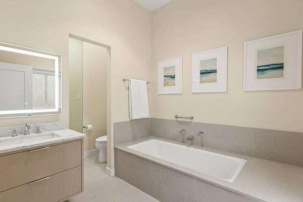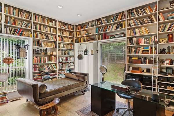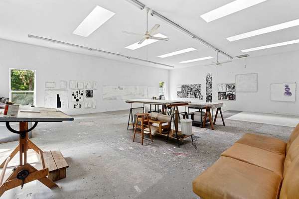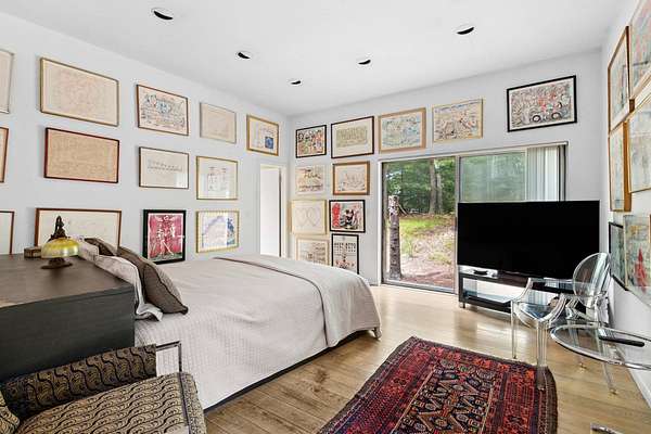 Tucked deep within East Hampton's storied Northwest Woods, this extraordinary 2.67-acre retreat is a rare blend of artistry, architecture, and absolute privacy. Hidden at the end of a quiet, private road, the property offers a serene escape where minimalist design meets the organic rhythm of nature, crafted for those who seek both inspiration and seclusion. Anchored by two striking barn-style structures, the residence pays homage to Long Island's roots while embracing the spirit of a contemporary sanctuary. The main house features two luminous ensuite bedrooms with soaring 10-foot ceilings, wide-plank white oak floors, and a wood-burning fireplace that warms the space during the Winter, Fall, and early Spring months. Walls of glass draw in soft woodland light, blurring the line between indoors and out. The expansive and light-filled living room is the perfect room to host family and guests. At the center of the home, a vine-draped glass atrium covered by a massive wisteria with an abundance of seasonal flower clusters-offers a poetic space to dine al fresco, stargaze under summer skies, or tend to garden beds in the tranquil courtyard. It's a passage, a portal, and a seasonal living room all in one. Just beyond, a 1,600+- sq. ft. artist's studio awaits-a soaring great room with 12-foot ceilings, eight skylights, and panoramic windows that flood the space with shifting light throughout the day. Purpose-built for creativity but versatile enough to reimagine as a guest wing, private museum, or grand living space, this structure can be easily adjusted into an intimate space or left as a grand room. Set at a distance from the main house, the 20'x40' pool emerges from the landscape like a hidden woodland pond-elevated to catch the breeze and dappled light, it invites a sense of stillness and renewal. With no neighbors in sight, this outdoor realm feels completely your own. Despite its deep sense of privacy, the property is just minutes from East Hampton and Sag Harbor villages, the bay and ocean beaches, and miles of scenic trails. Golf, tennis, and fine dining are all within easy reach-though you may find yourself content to simply stay put. With room to grow-whether by expanding the main living areas or transforming the studio, the home offers a rare opportunity to shape a truly personal retreat. Add a tennis court, create a guest cottage, or preserve its clean-lined simplicity. Whether you're a weekend escapee, artist, musician, writer or a collector - this is a home that inspires. A place to live, create, and dream.
