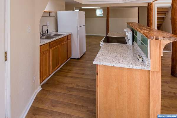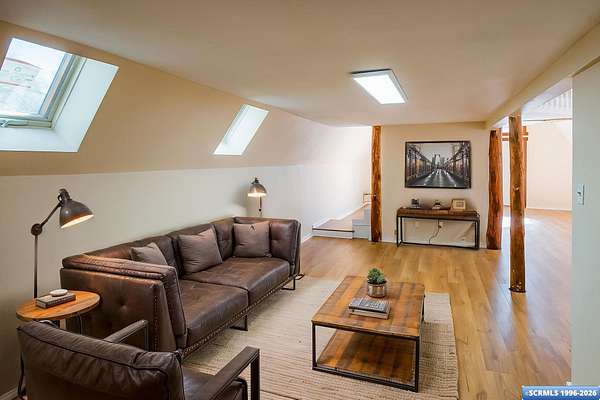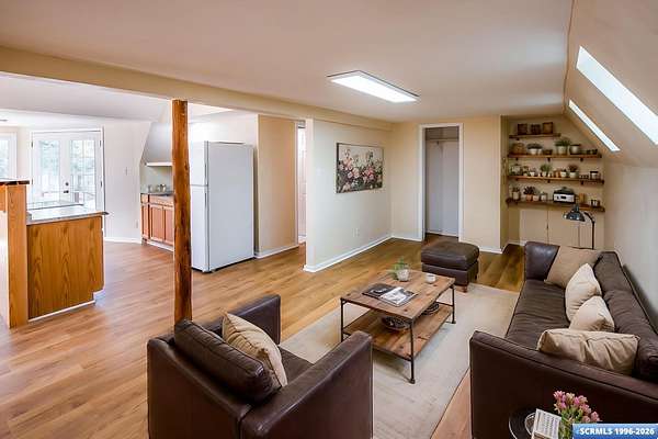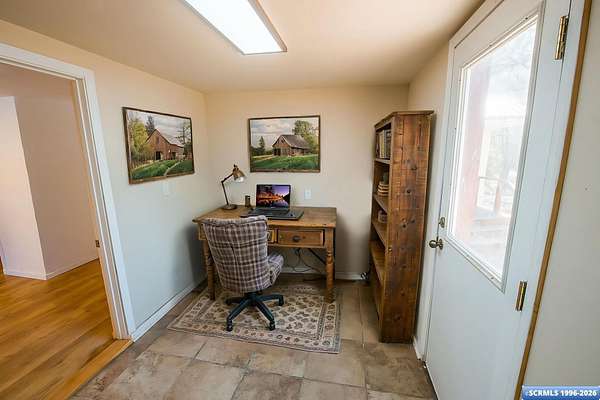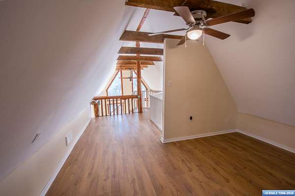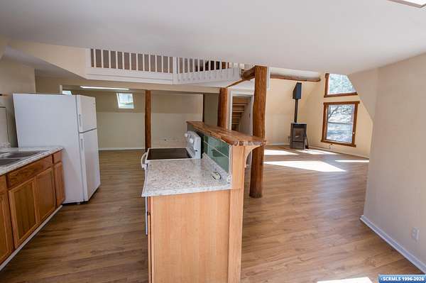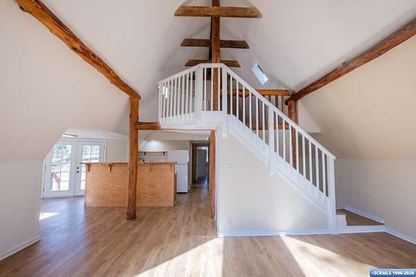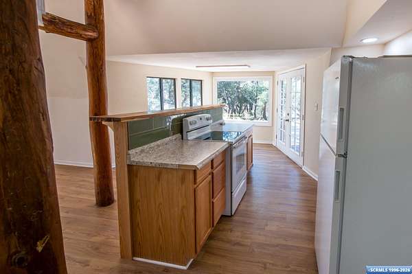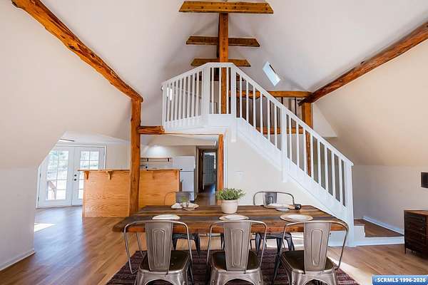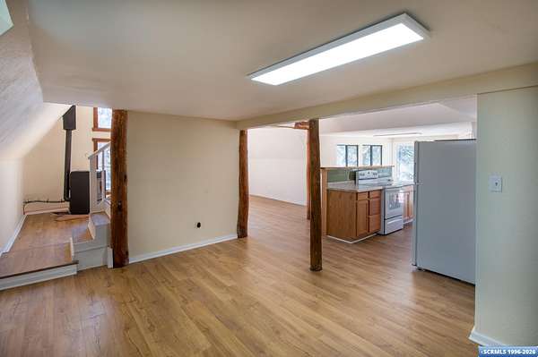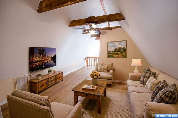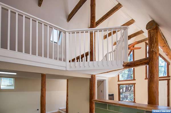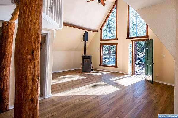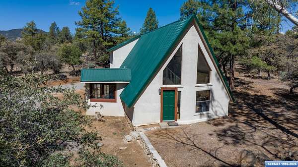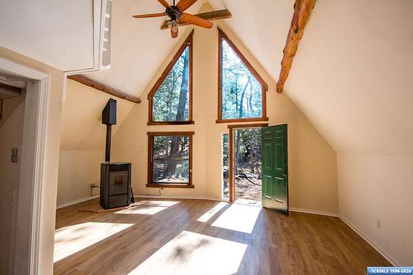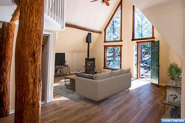 Nestled in the tranquility of the woods, this A-frame home offers the perfect blend of seclusion and accessibility-just minutes from town. Living room boasts a cozy wood stove, ideal for keeping warm on chilly nights, while an additional media room or office space provides versatile options. Upstairs, the master bedroom with a convenient three-quarter bath offers privacy and comfort, and the open loft area makes a perfect office, meditation or craft space. The home has new appliances, bathrooms, and new flooring throughout. The durable metal roof adds to the home's lasting appeal, while the hand-peeled beams and rustic woodwork create a warm, inviting atmosphere. BUYER MUST CONFIRM SQ FT - assessor shows 1909, but measurements obtained are about 1450 sq ft. Assessors record does not appear to be correct. Septic inspection/certification recently done and complete! With its serene surroundings and updated features, this home is a rare find!